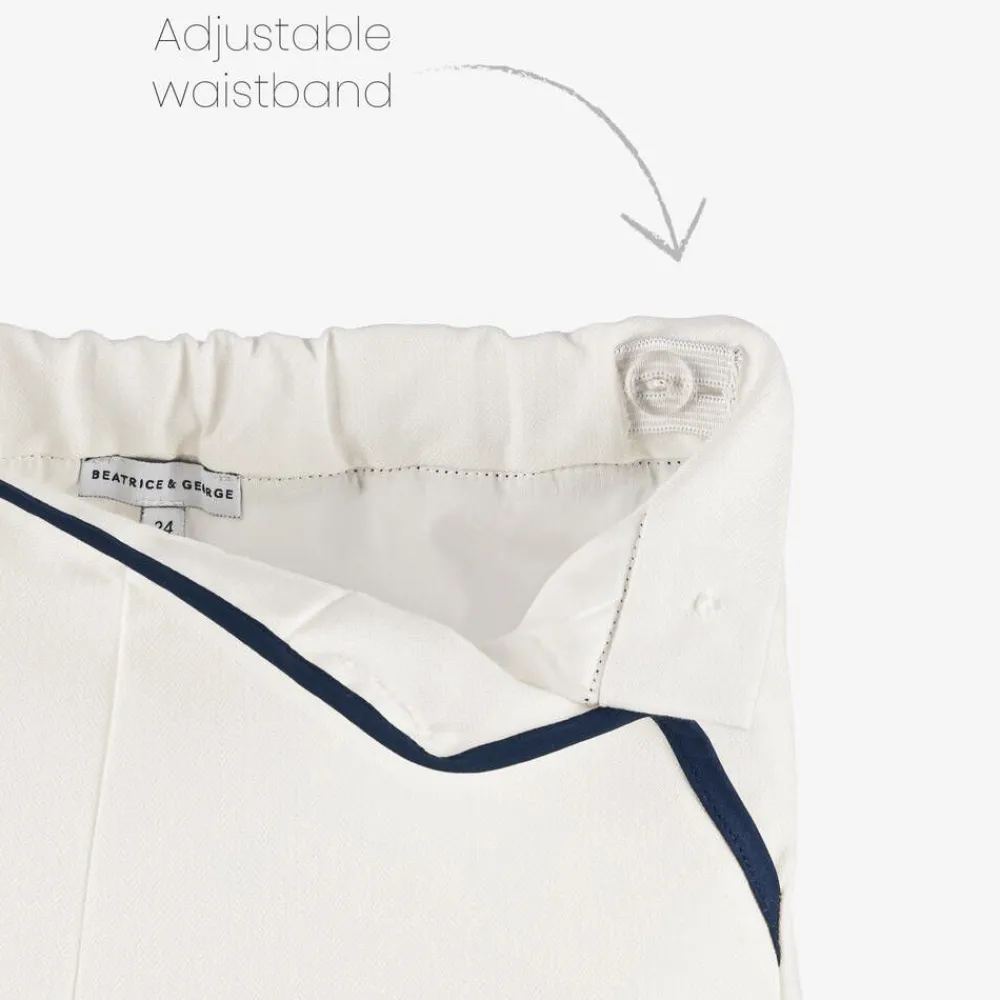 Smart ivory two piece shorts suit for boys by British heritage brand Beatrice & George, exclusive to Childrensalon. Made in a soft viscose blend, the jacket has a traditional sailor collar, with navy blue and ivory grosgrain ribbon trims. On the front there is an embroidered crest logo badge, with fabric-covered button fastenings and faux pockets. The coordinating shorts have a comfortable, adjustable, button-fastening waistband that is elasticated around the back for a good fit. The suit is fully lined in cotton voile for comfort.