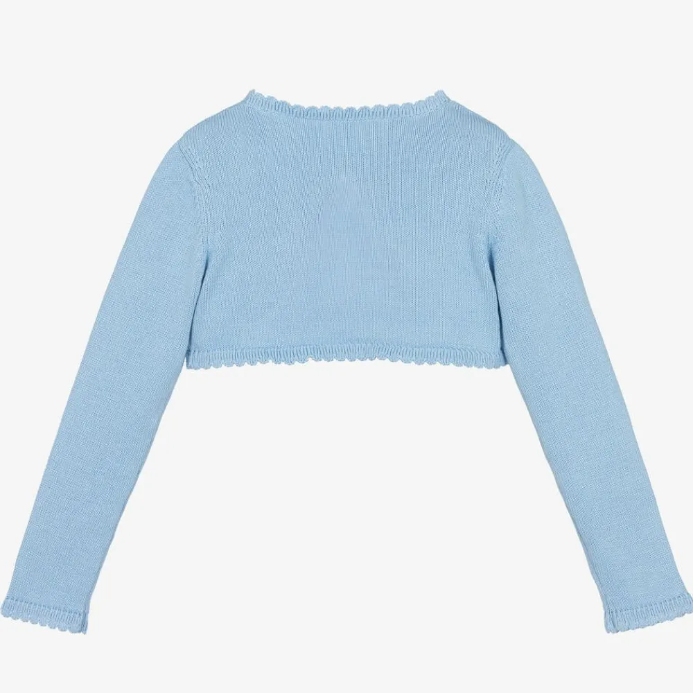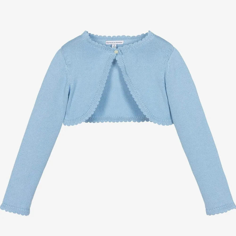 Lovely blue long-sleeved bolero cardigan for girls from classic British brand Beatrice & George, exclusive to Childrensalon. Knitted in beautifully soft cotton for comfort, this timeless style is shaped at the front with a single button fastening and a pretty scalloped trim.