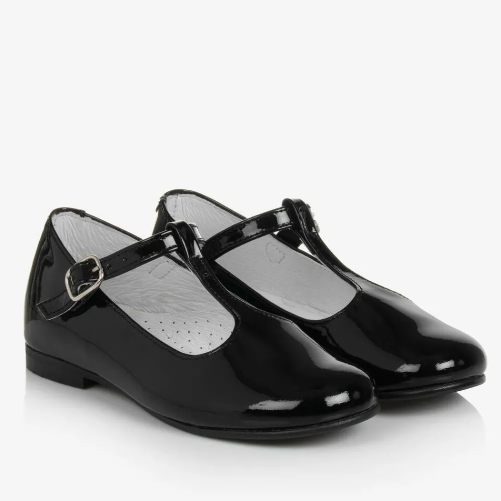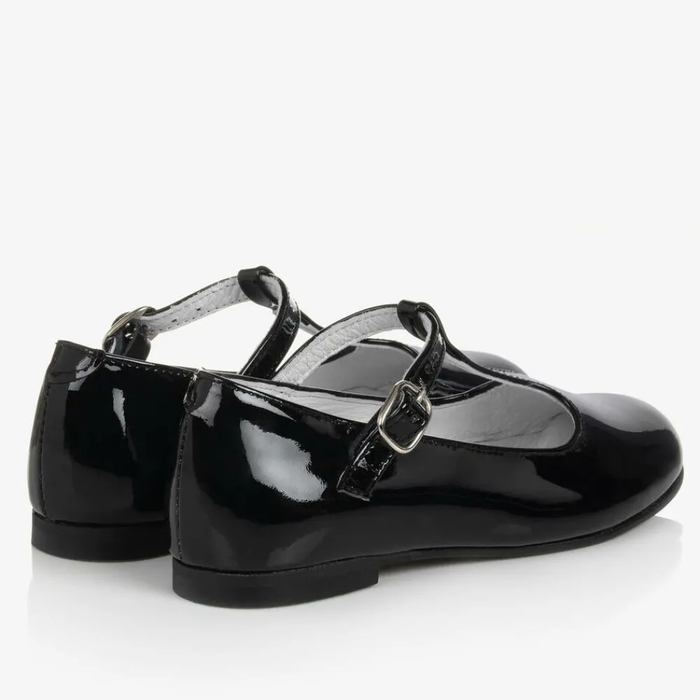 Black T-bar shoes for girls by traditional British brand Beatrice & George, exclusive to Childrensalon. Made in soft, supple, patent leather, they have a cushioned footbed for comfort and a super soft leather lining. They fasten with a silver buckle and have a faux leather outer sole.