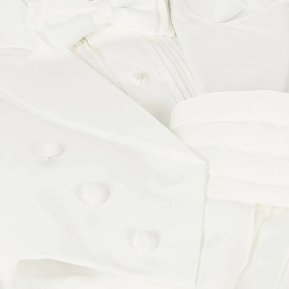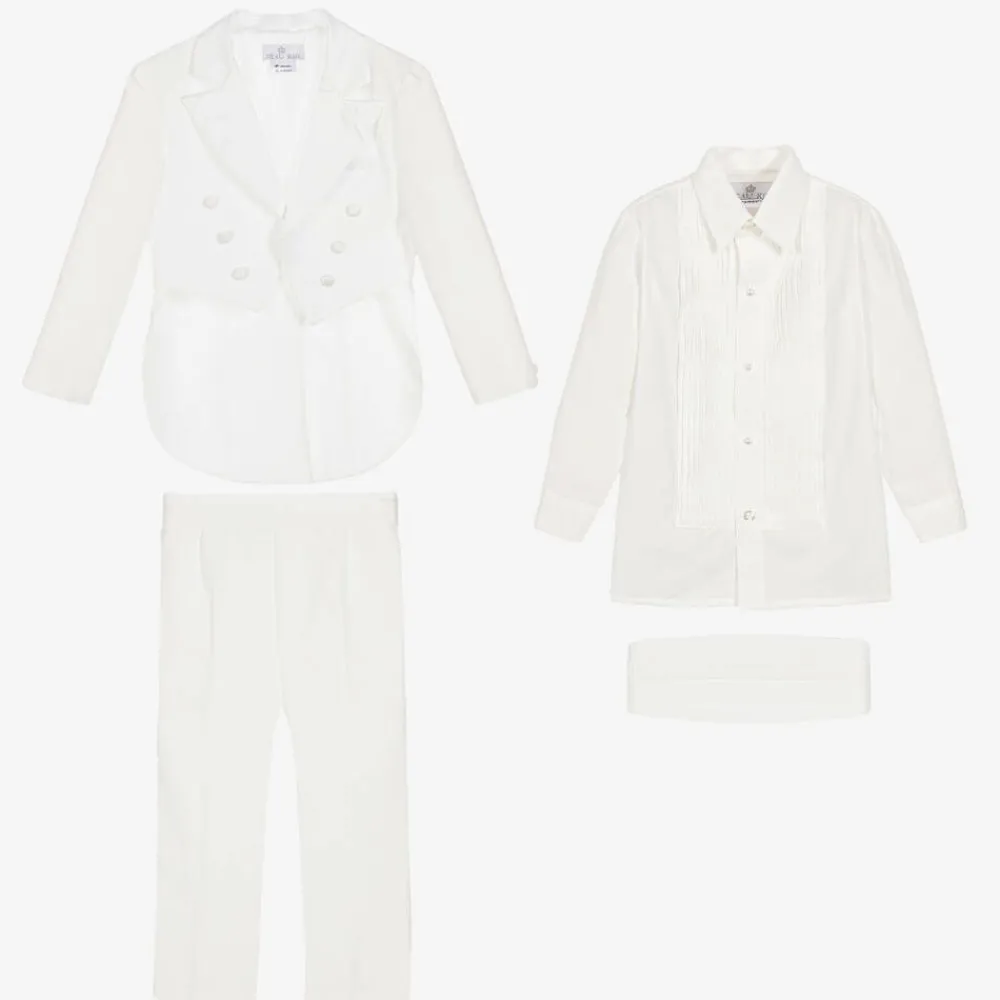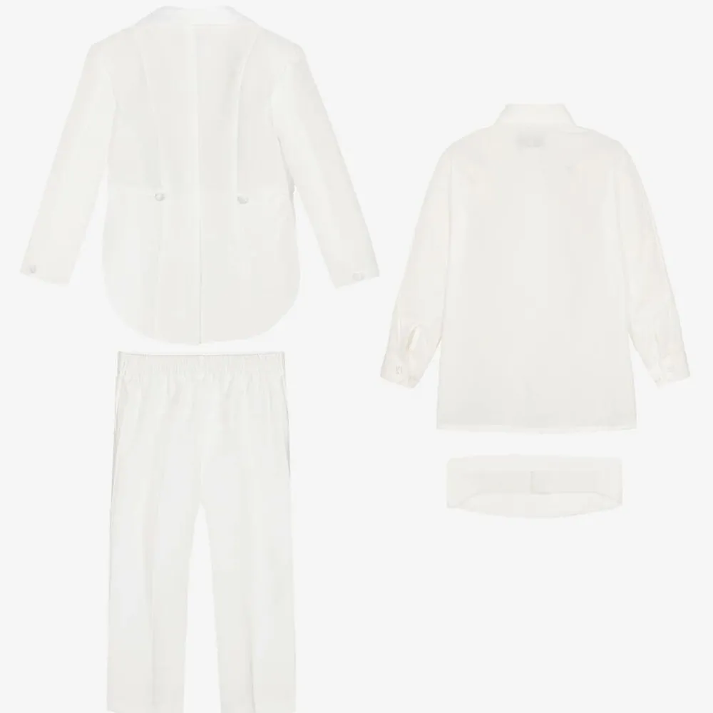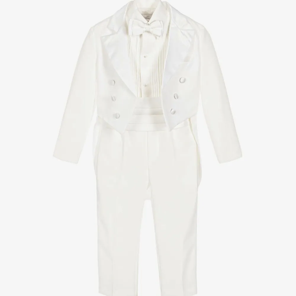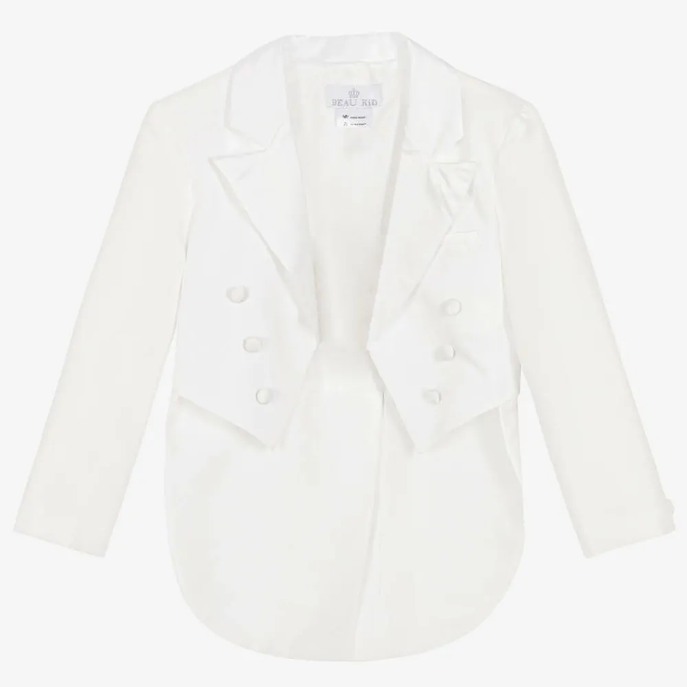 Boys ivory tuxedo suit by Beau KiD. The tail jacket and trousers are made in a lightweight twill, with satin trim to match the cummerbund and bow tie. The jacket is designed not to fasten and the trousers have an elasticated waist. It comes with an ivory cotton blend dress shirt. The fit can be quite big, so we recommend you check measurements before ordering.