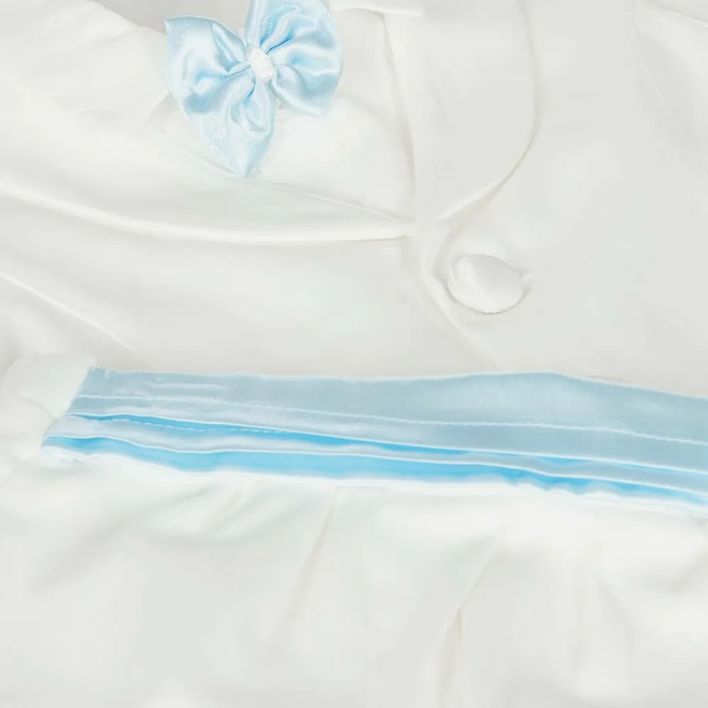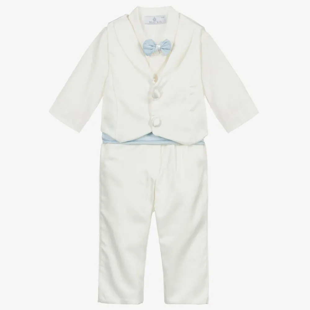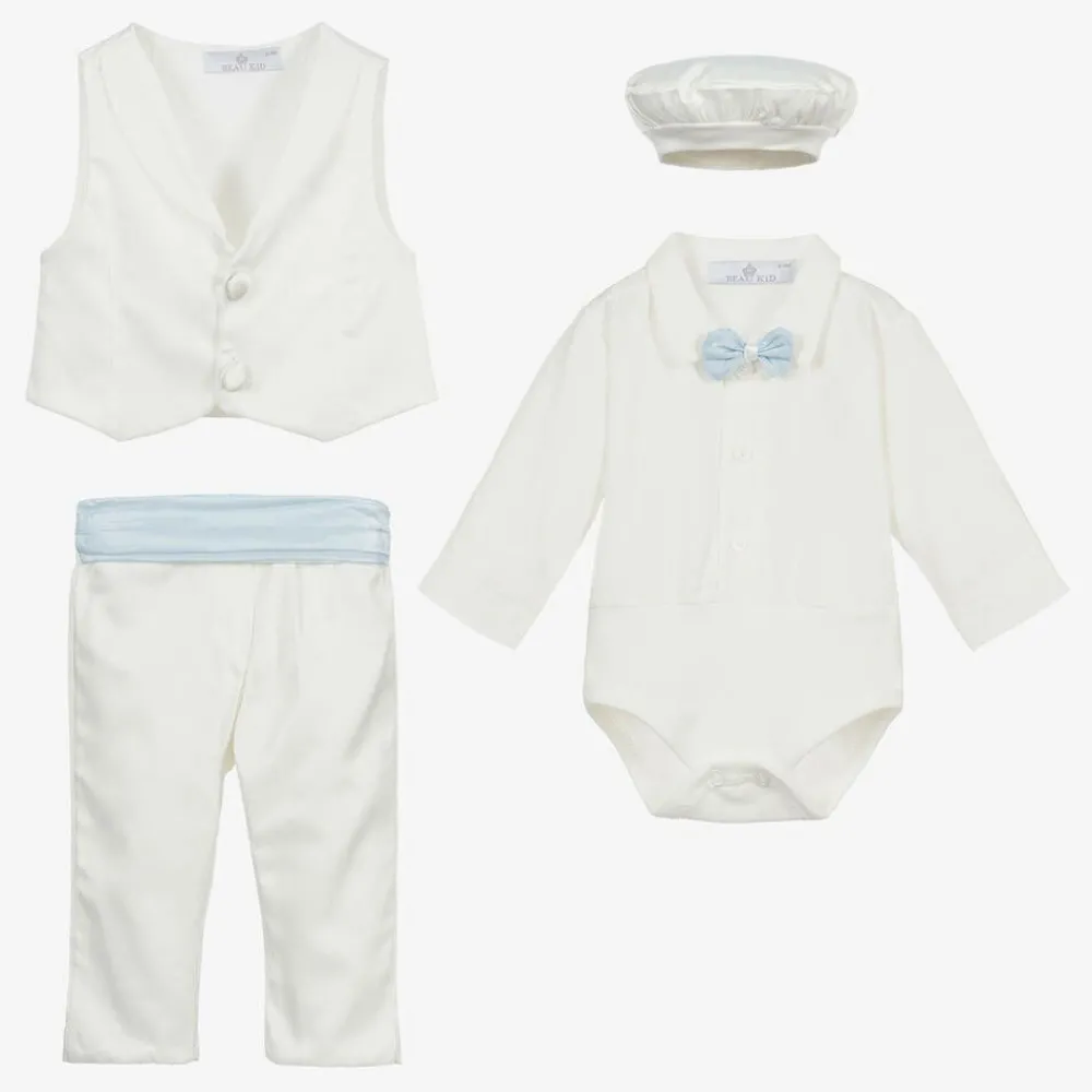 Smart ivory waistcoat suit for baby boys by Beau Kid. The lightweight bodyvest has an attached pale blue bowtie and stretchy jersey lower part which fastens with poppers and will stay neatly tucked in. The sateen trousers have an attached blue cummerbund and have an elasticated waistband for comfort. The matching sateen waistcoat fastens with buttons, and there is a hat to complete the outfit.
