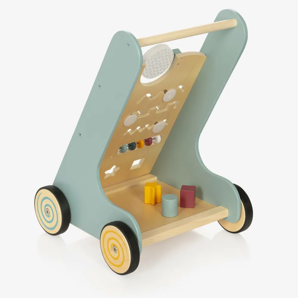 A wooden activity walker for little boys and girls by Bigjigs, great for educational play. Giving your child the confidence to walk, this stroller teaches them how to walk with a handle and rotating wheels. It also aims to develop fine motor skills and dexterity, filled with a variety of fun activities. This includes a flip-over mirror, spinnable cogs, sliders, and a shape sorter.
