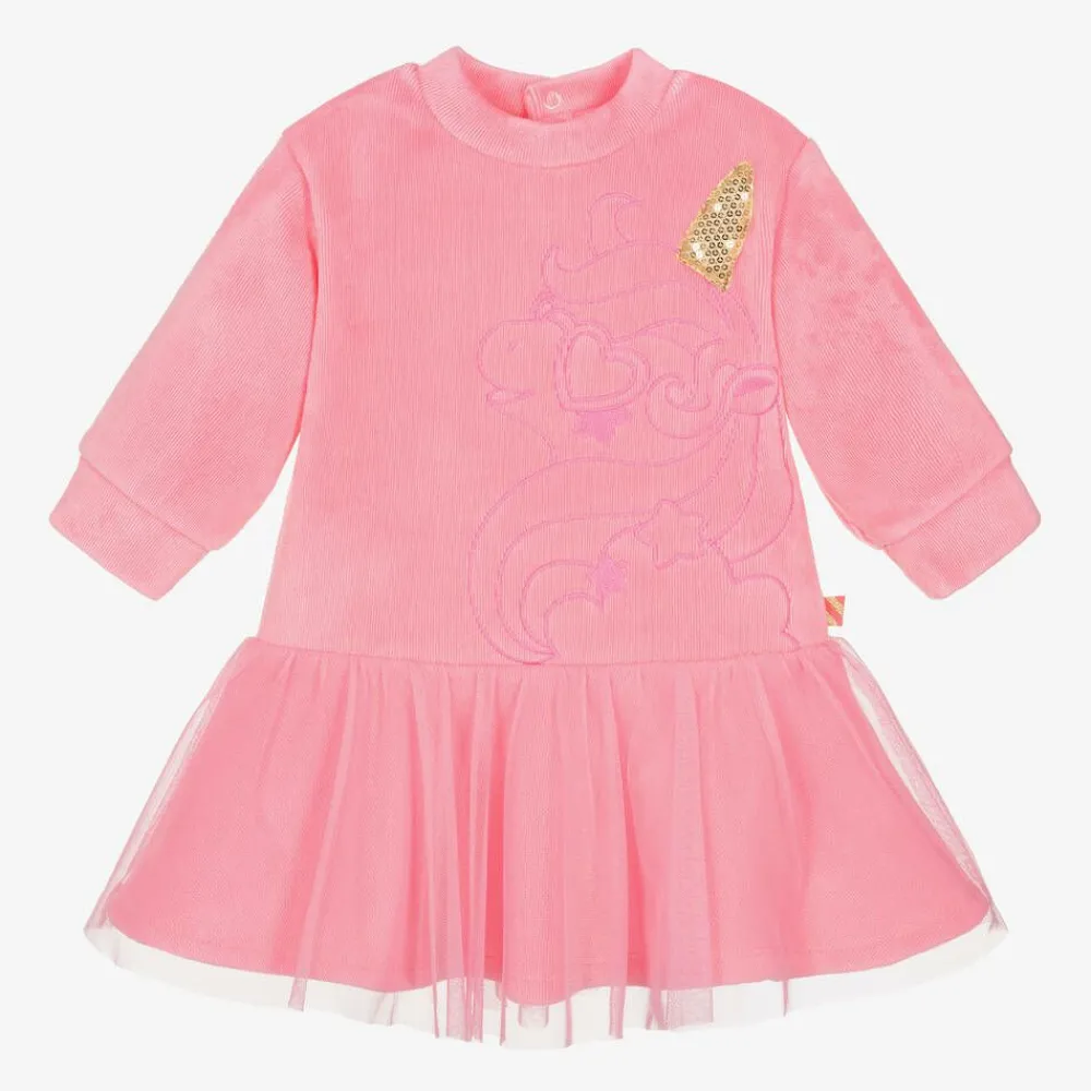 A cute dress for younger girls by Billieblush, in the designer's famous neon pink shade. A fabulous unicorn is embroidered on the front, with a sparkly sequin 'horn' in gold. Super cosy, this long-sleeved dress is made in soft, stretchy, mid-weight velour, with a fine stripe pattern and plush-feel underside. The dropped ruffle hem has a tulle overlay and there are hidden poppers on the back to help with dressing.