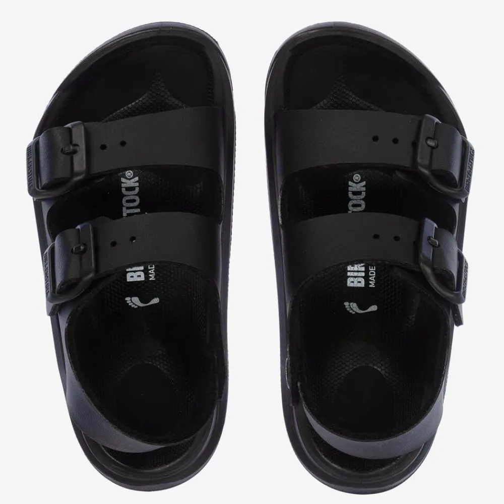 Black German-made sandals for boys and girls by Birkenstock. The straps are made from soft yet durable Birko-FlorĀ® faux leather with two branded buckle fastenings for an adjustable fit. The waterproof and contoured footbed comes with a toe guard for extra protection. Flexible and hard-wearing in any terrain, the chunky outsole features moulded deep tread for improved grip and a sporty look.