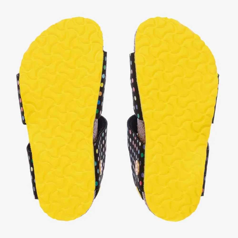 Black sandals for girls by Birkenstock, with colourful polka dots, rivet detailing and a narrow fit. The straps are made from Birko-FlorĀ® soft faux suede with both velcro and yellow buckle fastenings. They have a soft leather moulded insole and a yellow, non-slip rubber outsole. The anatomically contoured footbed promotes good walking posture, making them a great choice for healthy growth.