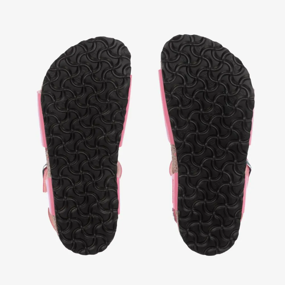 Pink faux leather sandals for girls by Birkenstock, with branded metal hardware. In the German brand's Rio silhouette, these narrow-fit sandals have buckle-fastening straps across the foot and a pivoting strap on the heel to help the shoes fit securely. Ergonomically designed, they have breathable suede leather insoles for comfort and natural cork midsoles for that classic Birkenstock look. The non-slip soles are ultra-lightweight and treaded for improved grip.