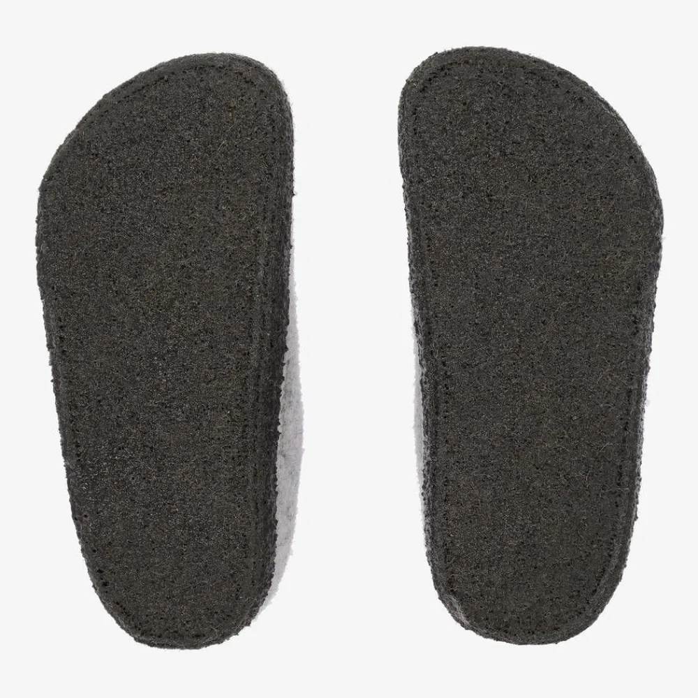 Grey felted slippers by Birkenstock. Lined in fluffy, cosy shearling wool, they will keep feet warm and cosy during the colder months. They have a grey rubber outer sole and slip-on style. The anatomically contoured footbed promotes good walking posture, making them a great choice for healthy growth.