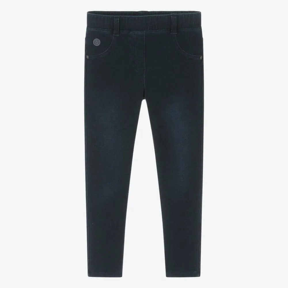 Casual dark indigo blue denim look jeggings for girls by Spanish brand Boboli. made in a soft and stretchy cotton blend jersey. They have belt loops, faux pockets with silver rivets and an embossed logo tab on the front. There are two patch pockets on the back and an elasticated waistband for easy pull-on.