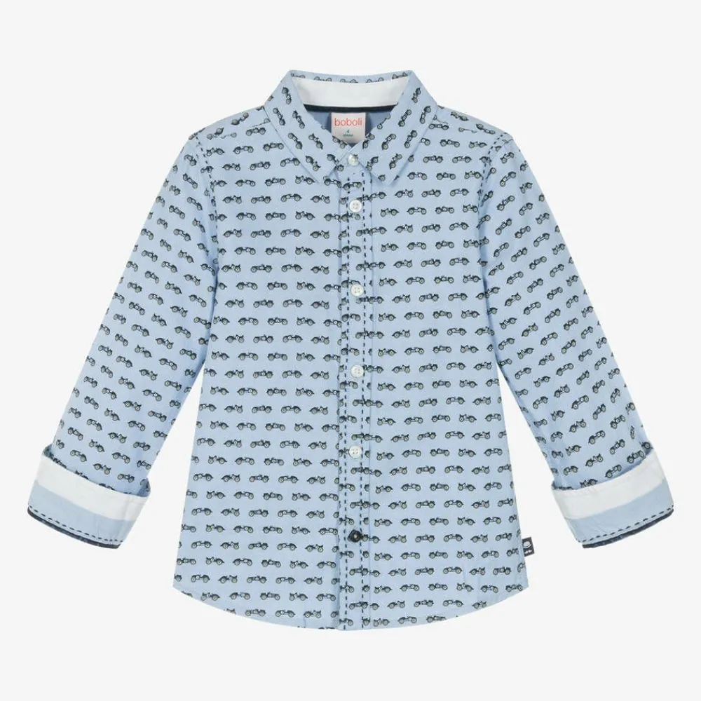 A three-piece trouser set for younger boys by Spanish brand Boboli. Knitted in a soft cotton and wool blend, the beige sweater has comfortable ribbed trims and a fun racing car design on the front and back. The Oxford cotton shirt, patterned with matching cars, has front button fastenings, a collared neckline and a curved hem for a more casual look. Fine needlecord trousers, in a slim fit, have extra stretch to ensure freedom of movement. The narrow grosgrain trims add texture and the adjustable waistband allows for a changeable fit.