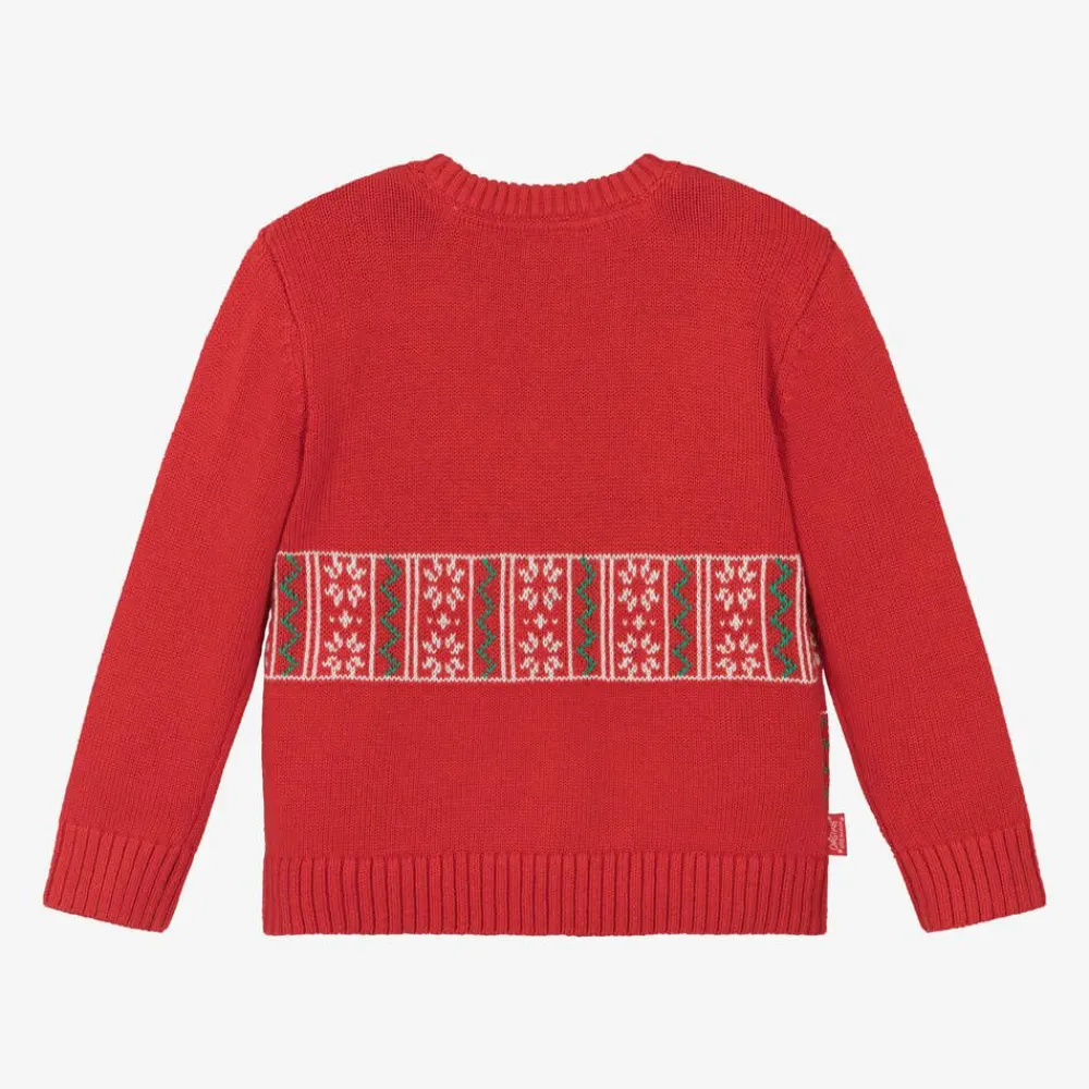 A bright red sweater for boys and girls by Boboli, knitted in a soft cotton blend. This warm and cosy piece is patterned with a sausage dog wearing a festive jumper and hat for a fun look. It has a rounded neckline and ribbed trims.