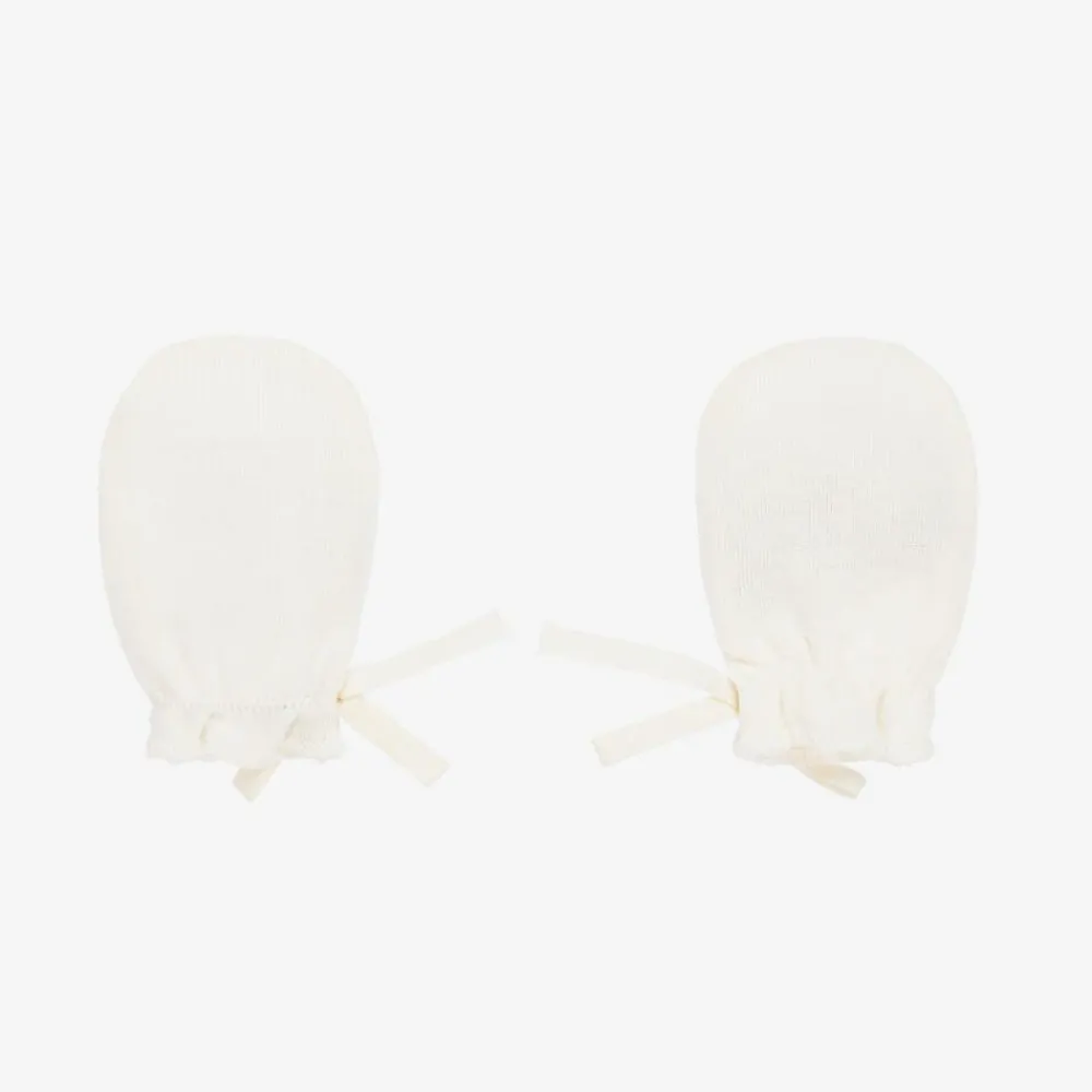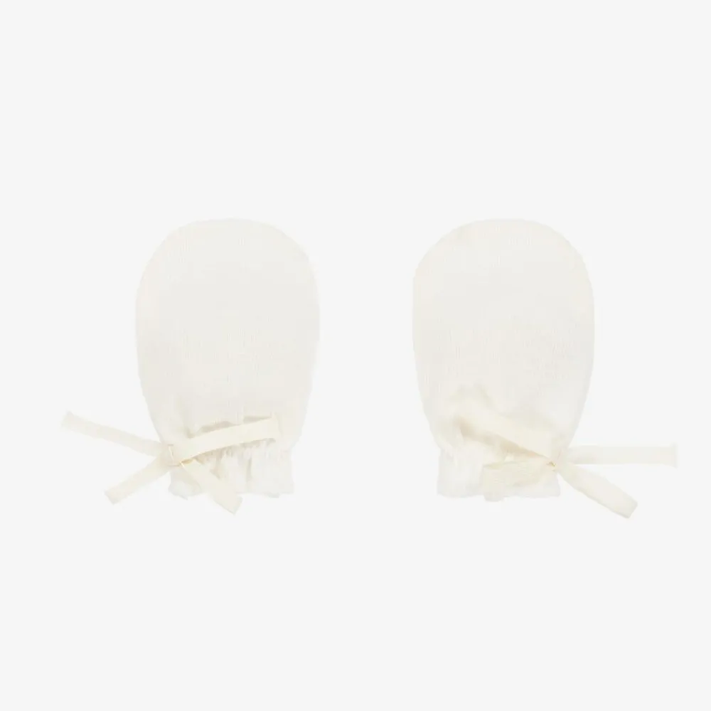 Ivory scratch mittens for baby boys and girls by luxury French brand Bonpoint. They are made in soft cotton jersey with stretchy gathered trims and sweet decorative bows.