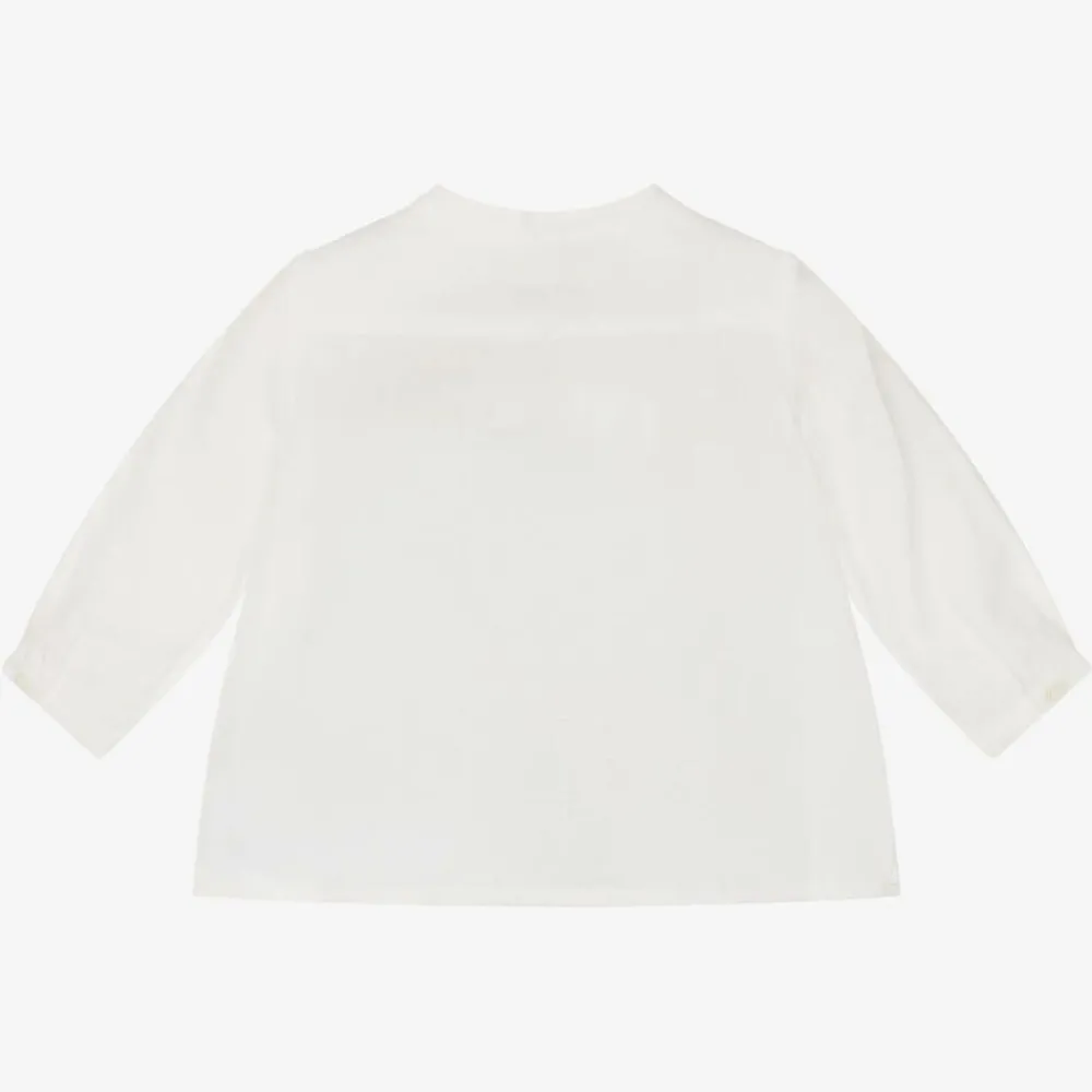 Little boys ivory shirt by luxury French brand, Bonpoint. Softly woven and lightweight, this delicate design has front button fastenings and buttons at the cuffs.