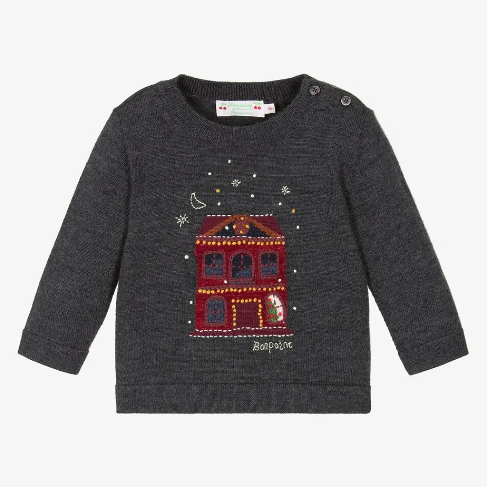 Sweet grey sweater for little boys and girls by French brand, Bonpoint. Knitted in luxuriously soft wool, it has a charming house embroidered on the front, with twinkling lights and a festive Christmas tree in the window. There are button fastenings on one shoulder to help with dressing.