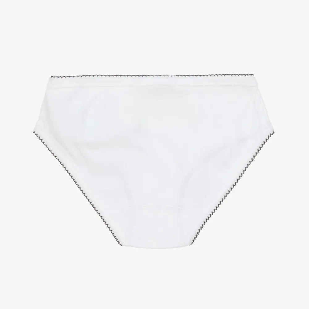 Seven pairs of white knickers for girls by French brand Bonpoint, made in comfortable cotton jersey. Designed for seven days of the week, these identically styled knickers are embroidered on the front and decorated with a pretty satin bow on the waistline. Each pair is designed with a picot trim in a differing neutral shade for a delicate finish. Lovely for gifting, this set is beautifully presented in a branded Bonpoint box.