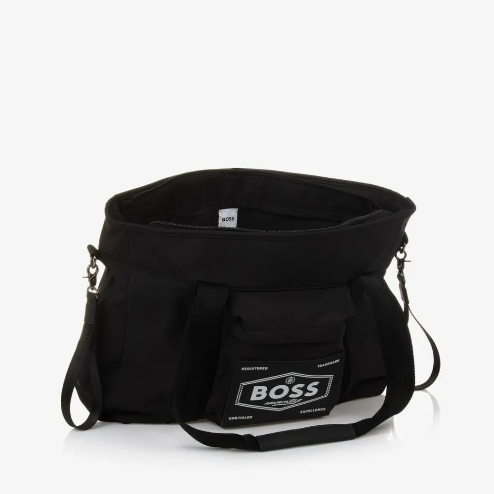 Instantly recognisable, a smart black changing bag by German brand BOSS, with 'The Original Boss 1977' logo badge on the zipped front pocket. Smooth and sleek, the main compartment has five mesh side pockets of varying sizes for neat storage of bottles and other essentials for baby. It fastens with a zip and has fixed, webbed carry handles, with detachable and adjustable shoulder straps and two useful buggy straps. The bag comes with a useful, padded changing mat.