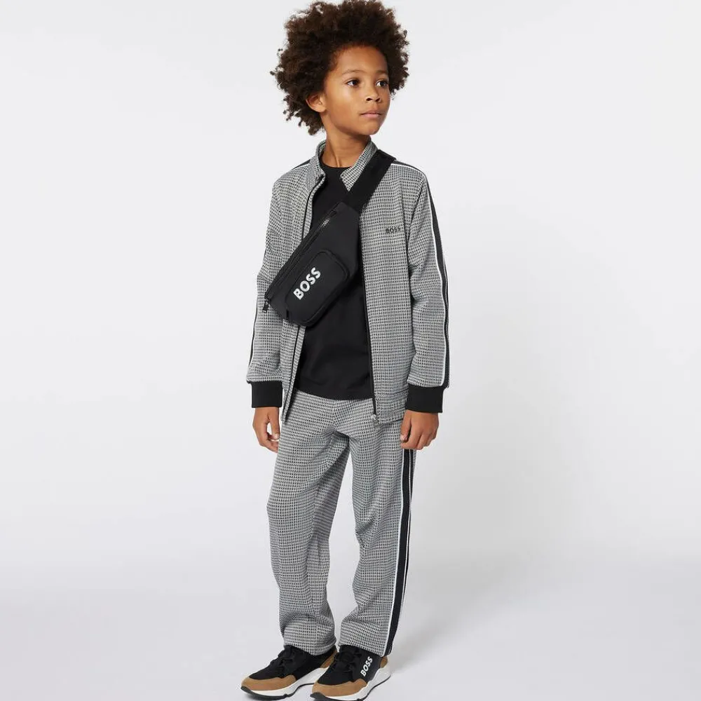 Stylish, Mini-me black belt bag for boys by BOSS, with a white logo print on the front. Made in silky smooth canvas, it has a main compartment and a front pocket, both lined in satin and secured with chunky zip fastenings. There is a comfortable padded mesh backing and the adjustable strap fastens with a plastic clip buckle. The bag can be worn over the shoulder in a cross-body style, or around the waist.