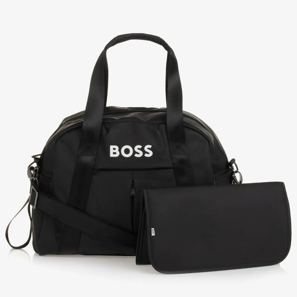 A black changing bag by BOSS, with a bold white rubberised logo on the front for designer appeal. Easy to wipe clean, the spacious zip-fastening main compartment has four internal mesh pockets to help organise essentials. There are easily accessible side pockets, ideal for bottles, a slip pocket on the back and a further small zipped compartment on the front. It has fixed carry handles on the top and comes with a detachable shoulder strap and two useful buggy straps. A matching lightly padded mat is included, great for changes on the go.