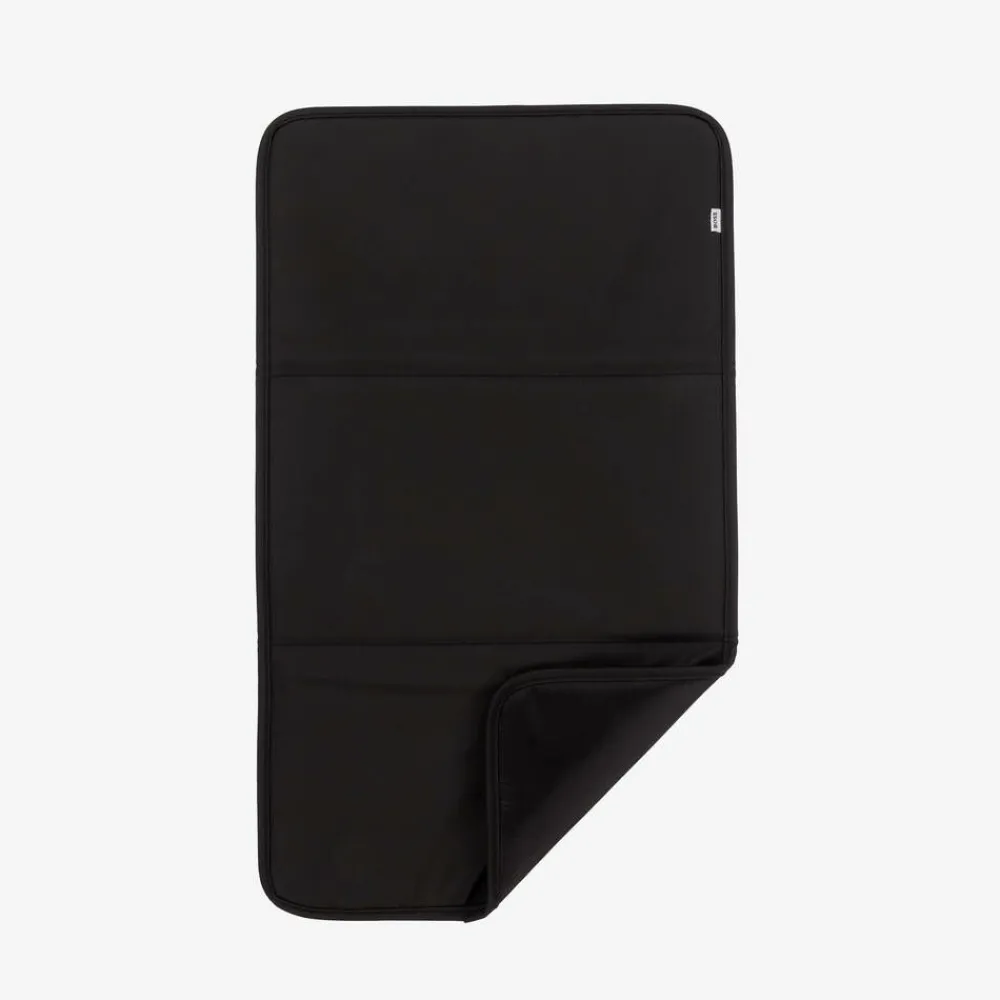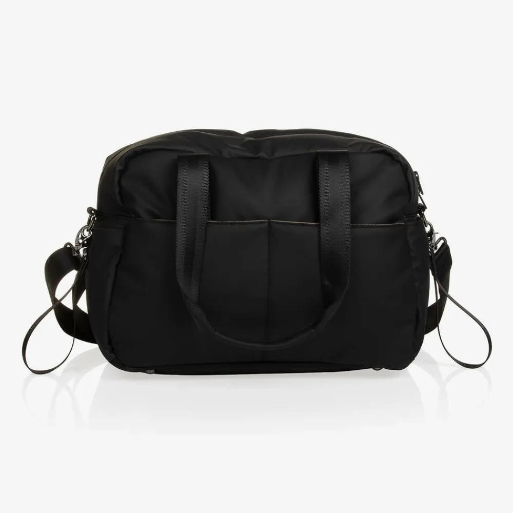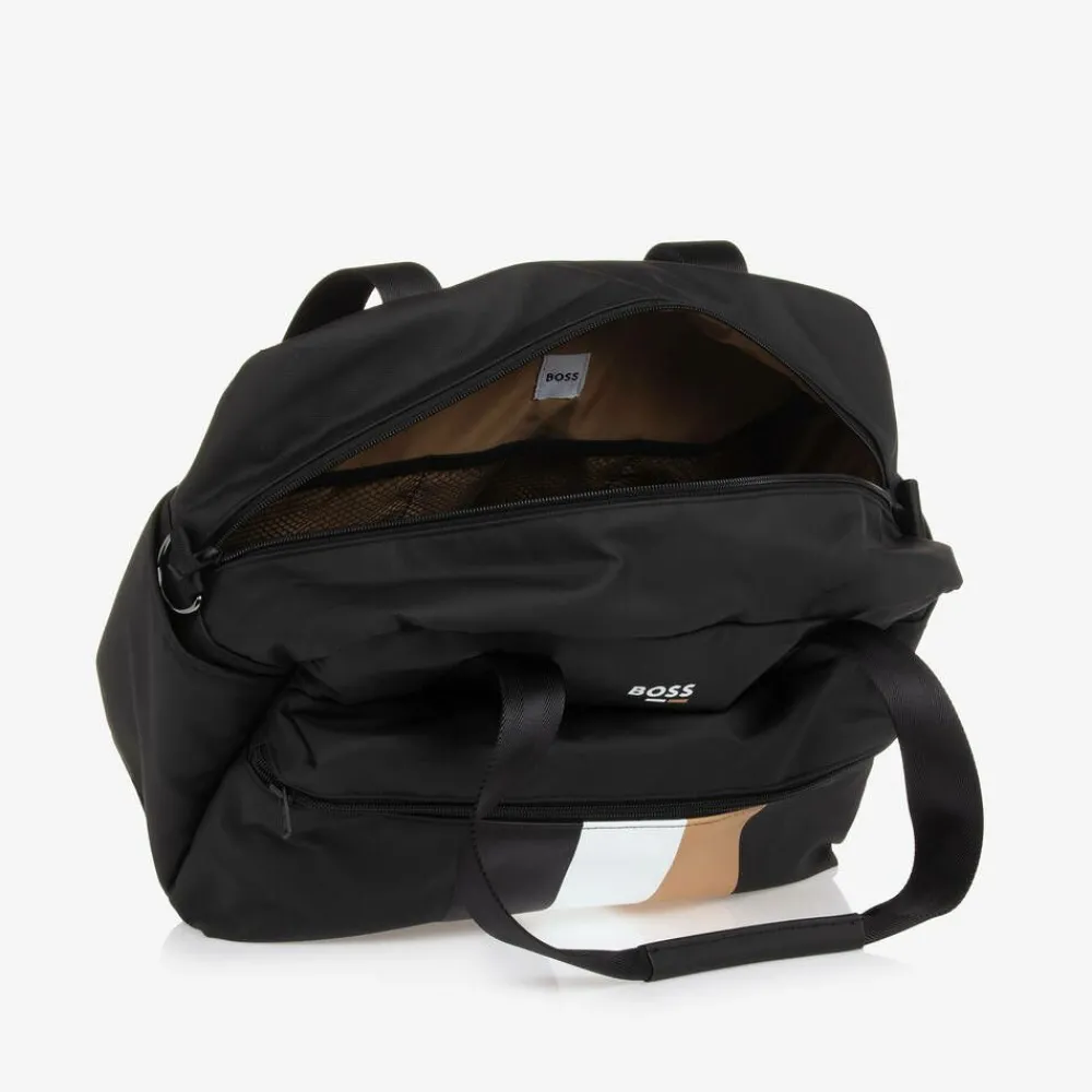 Black changing bag from German label BOSS, made in coated canvas for a practical wipe-clean finish. Lined in beige satin, it has multiple convenient outer and inner pockets to store baby's essentials. For instant, yet discreet, designer appeal, there is a small white logo print on the front, a panel in the brand's signature black, white and beige stripes, and branded zip fastenings. Styled with useful carry handles and a detachable shoulder strap, the bag comes with stroller straps for attaching to the pram. Included is a lightly padded changing mat and branded storage bag.