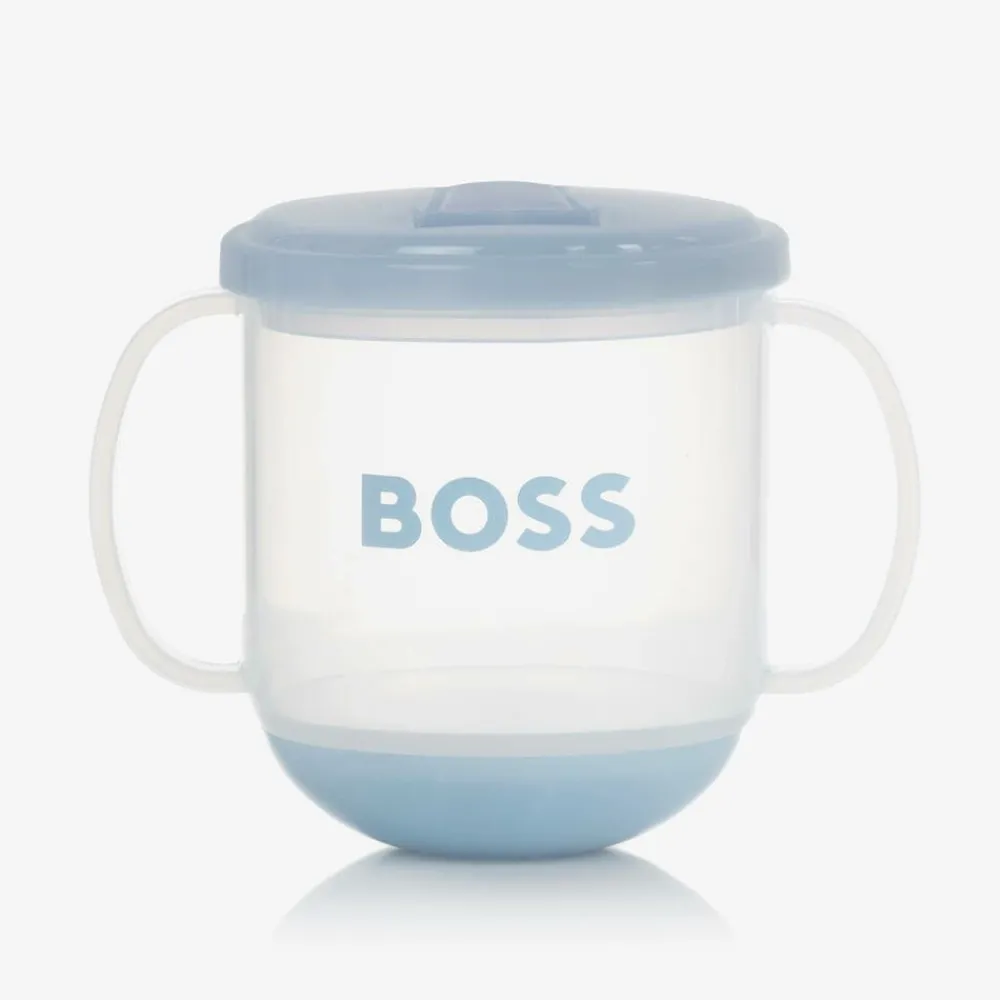 Pale blue sippy cup for boys and girls by BOSS, designed for little ones six months and up. BPA free, it has a removable lid for easy cleaning and a weighted base so it stays upright. The fold-down spout prevents unwanted spillages and it has two easy-to-hold handles. The brand's instantly recognisable logo is printed on the front in pale blue for a logo-inspired finish.