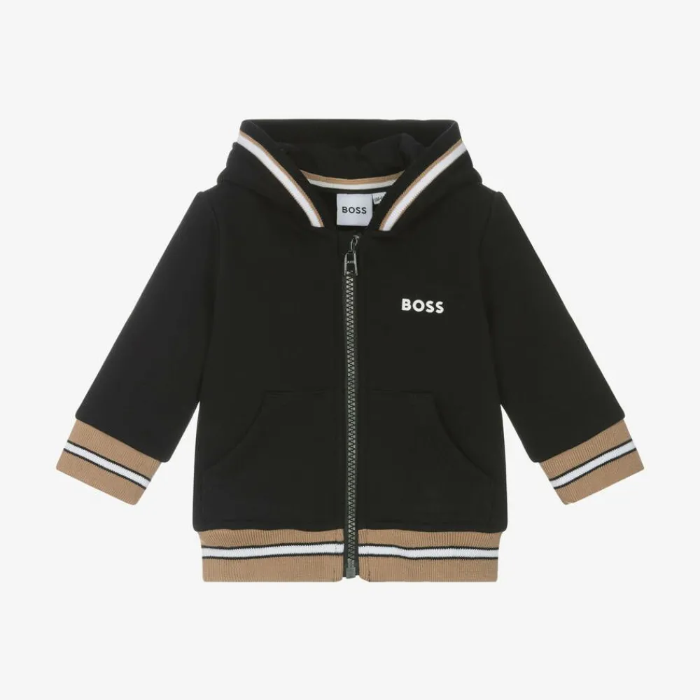 Black zip-up top for little boys by BOSS, made in mid-weight cotton jersey with a warm fleecy inside. Ideal for layering, this long-sleeved top has a front zip fastening and a cosy hood with signature striped trims. There is a white logo print on the chest, front pockets and beige, white and black stripes on the hem and around each cuff to match the hood.