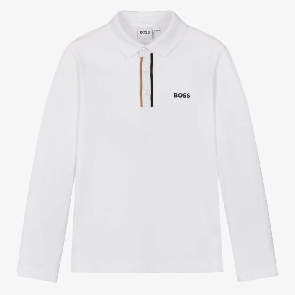 Long-sleeved white cotton polo shirt for boys by BOSS, with a black rubberised logo on the chest. Cool and comfortable, this piqué top has button fastenings on the front, with beige and black trims for a subtle designer finish.