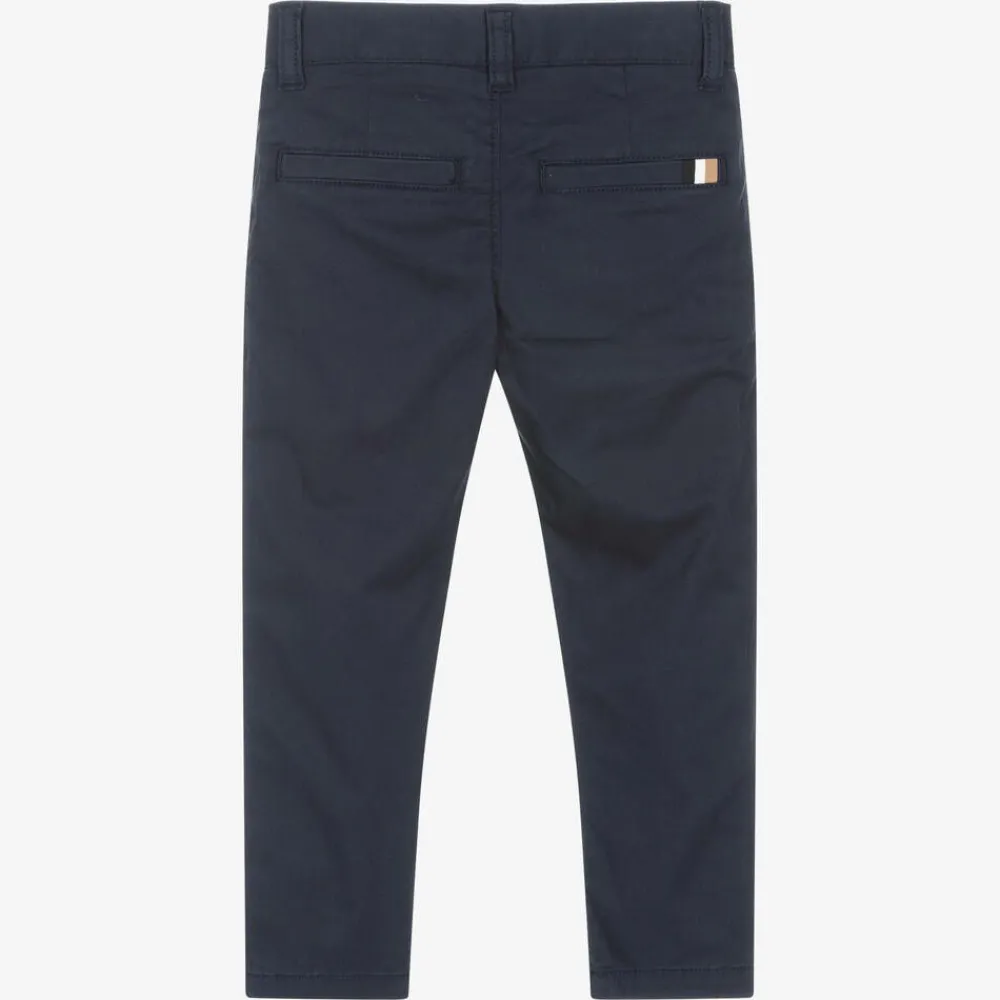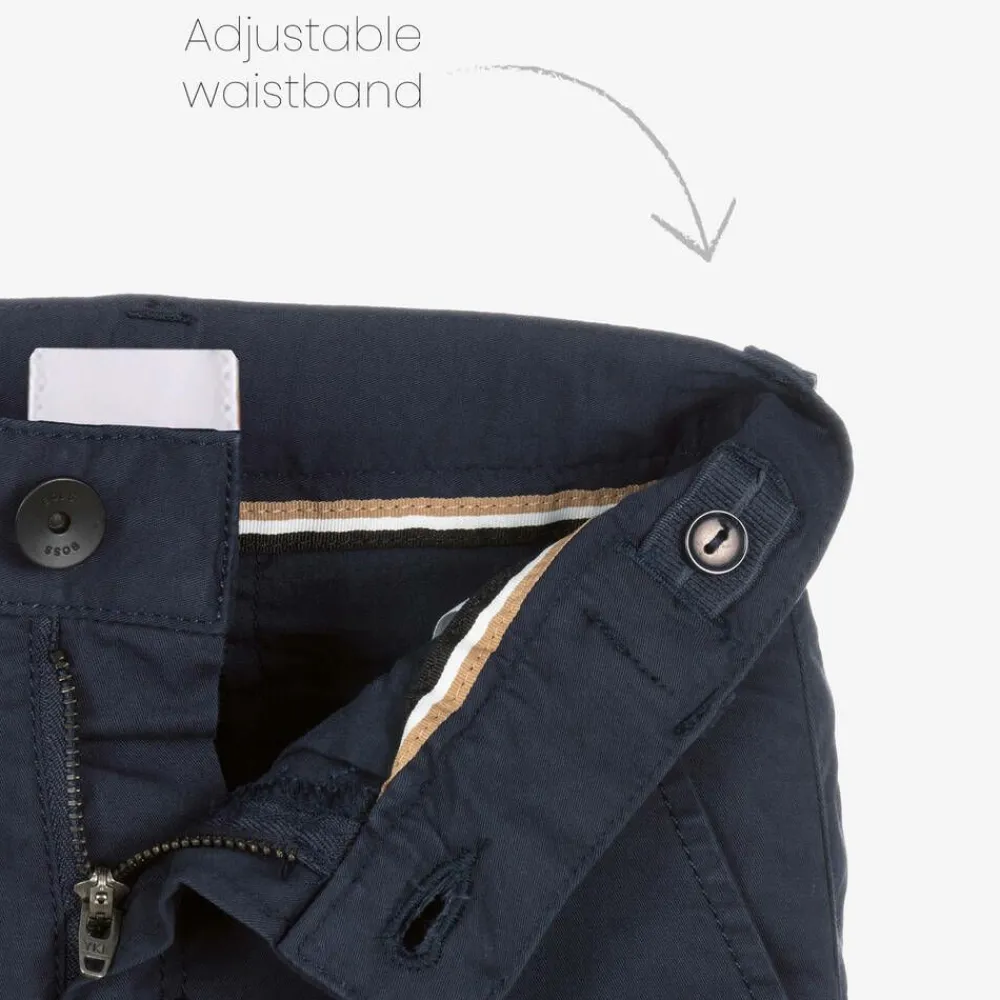 Smart-casual navy blue chino trousers for boys by BOSS, made in soft cotton twill with a little stretch for comfort. Slim-fitting, they have a useful, adjustable waist with belt loops. There are two slanted front pockets with a coin pocket and two pockets around the back, one with a signature tricolour trim. They fasten with a black logo button and zip on the front.