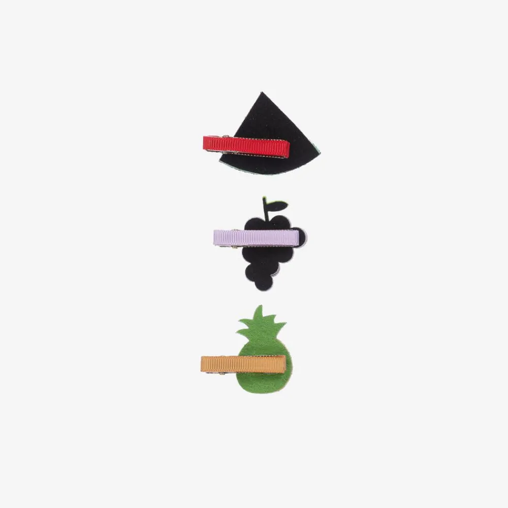 Cute pack of three, glittery gold, red and purple fruit hair clips for girls by Bowtique London. The sparkly pineapple, watermelon and grape designs are set on easy slide-in metal clips.