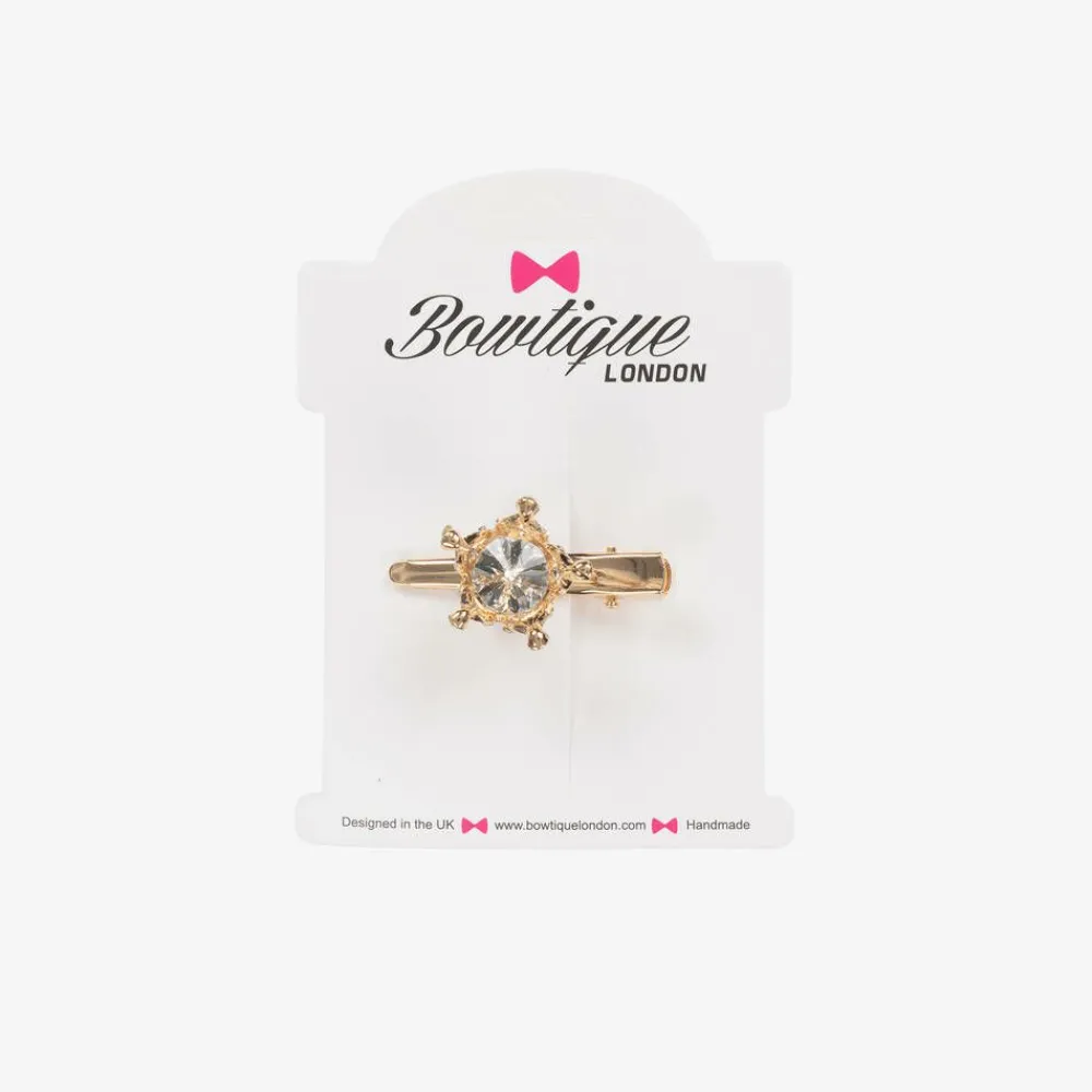 Lovely for glamorous occasions, this golden hair clip for girls is by Bowtique London. The crown design has a sparkly jewel centre and diamanté decorations for added shine. It has an easy-to-use metal clip fastening.