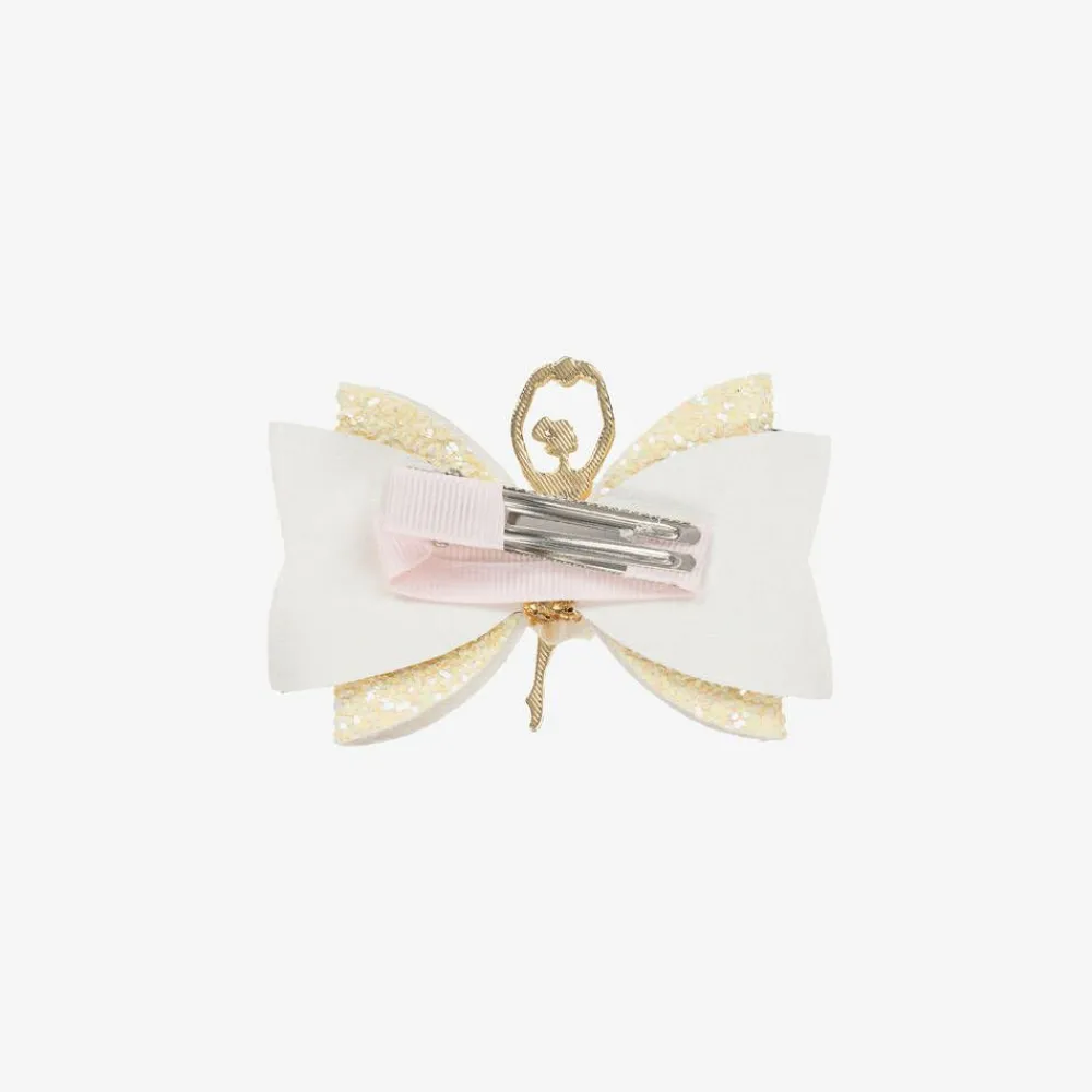 Pretty ivory and gold bow hair clip for girls by Bowtique London. Handmade in iridescent and gold glitter covered fabric, it has a lovely ballerina figure, with a sparkly diamanté tutu skirt and sets on a metal clip.