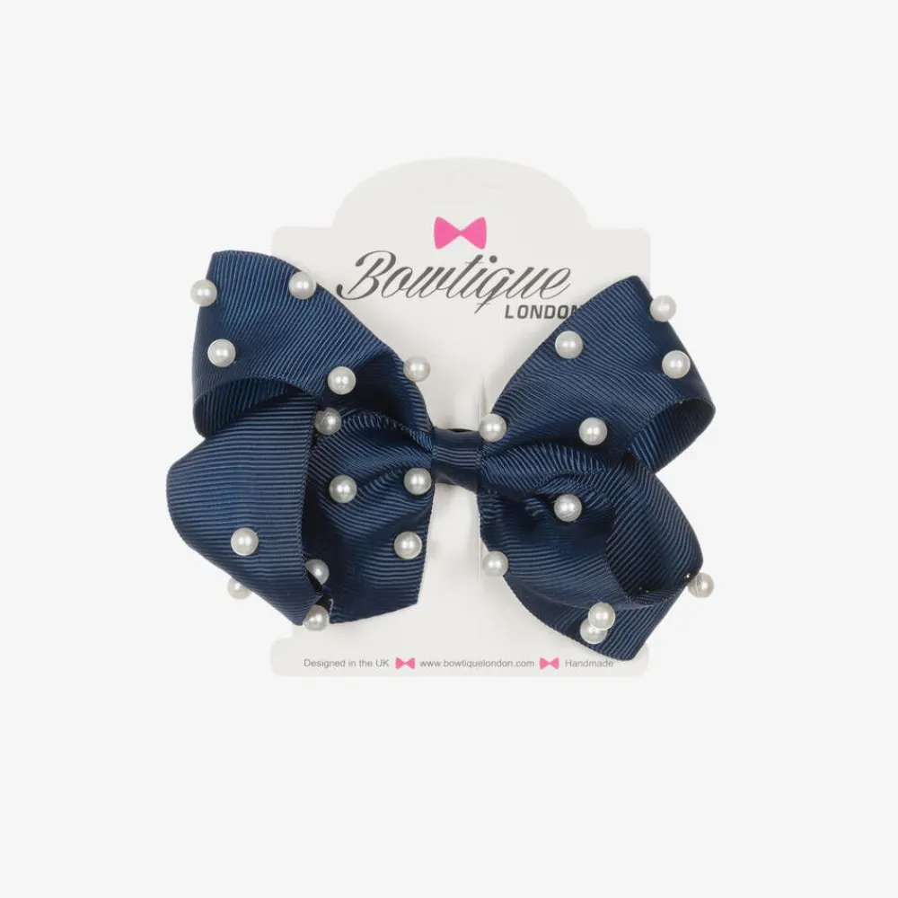 A pretty navy blue grosgrain bow hairclip for girls by Bowtique London, decorated with scattered faux pearls. It is attached to a metal crocodile clip.