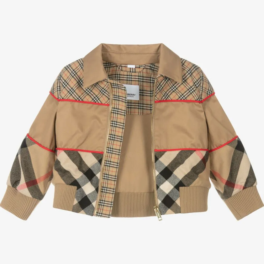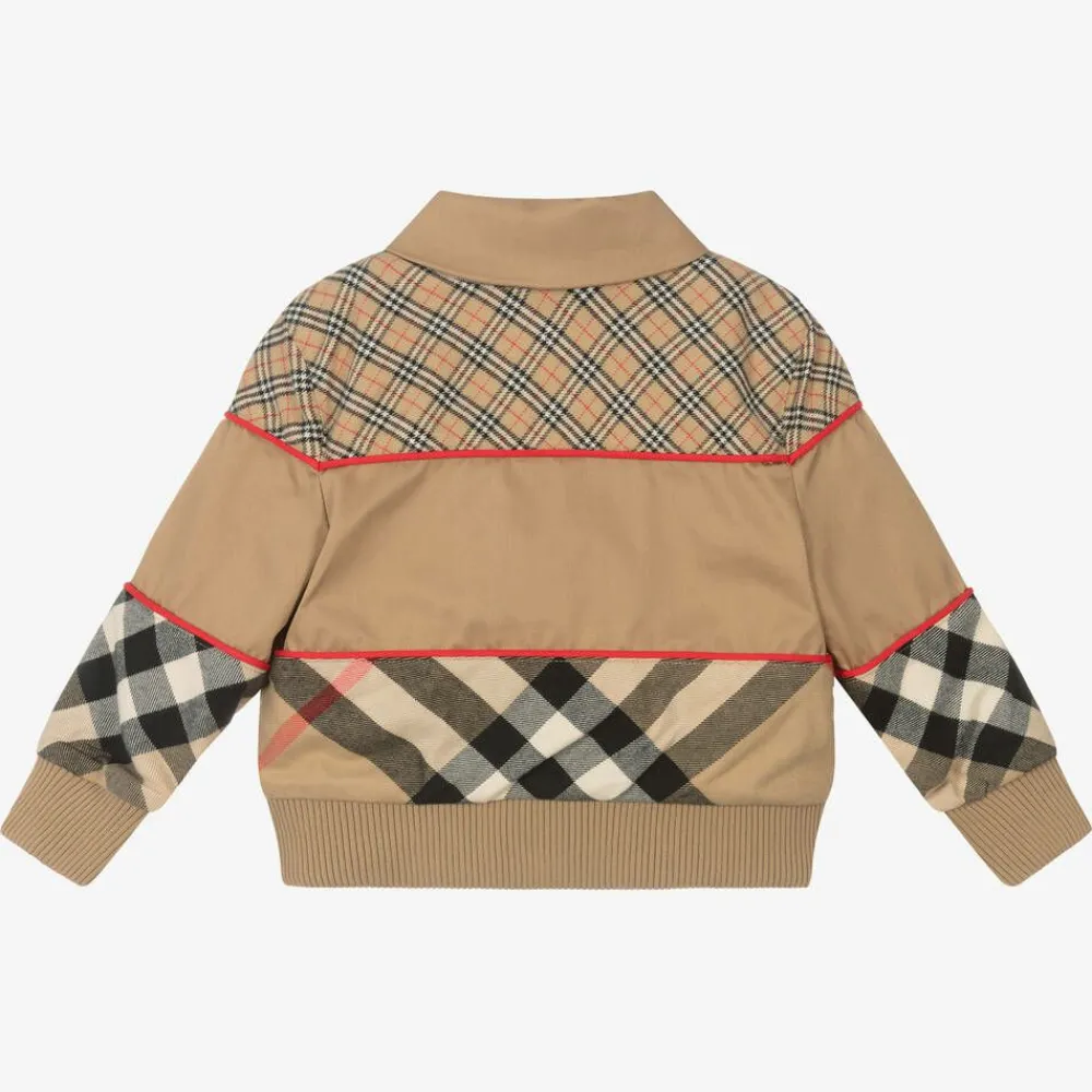 An archive beige cotton canvas jacket by luxury designer Burberry, comfortable and lightweight for baby boys. This outerwear piece is enhanced by brushed flannel panels patterned with the label's unmistakable microcheck across the shoulders, and exploded check on the sleeves, hem and collar underside. Lined with jacquard logo satin, the exposed gold zip fastening has a logo-engraved pull tab.