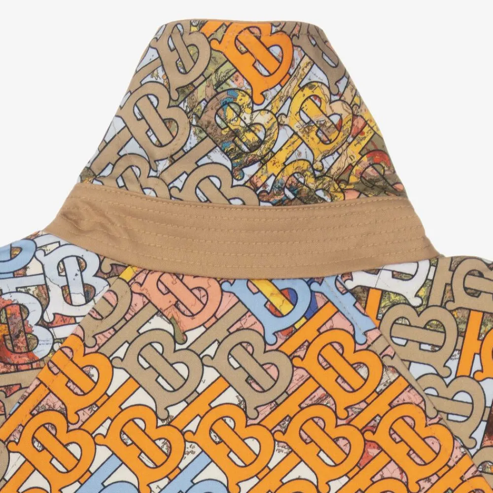 Archive beige and blue luxury trench coat for boys is from British brand, Burberry. It is made in soft cotton gabardine fabric, enhanced by eye-catching Monogram prints in shades of beige, orange and blue, with map accents. Traditional features include double-breasted button fastenings, a gun flap, belted cuffs and a storm shield. It is lined in silky cupro with a Burberry logo jacquard weave. Useful side pockets and a belt complete this stylish modern take on a classic piece.
