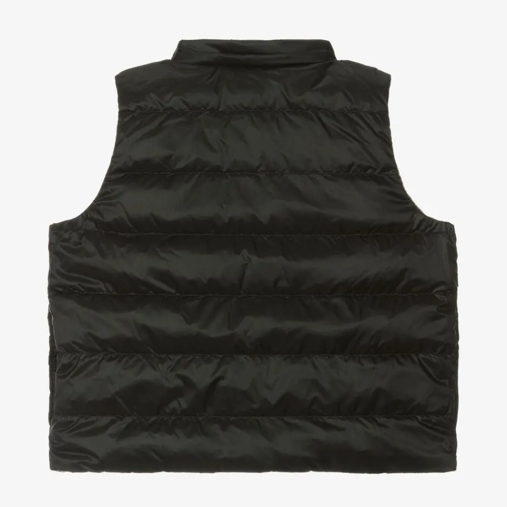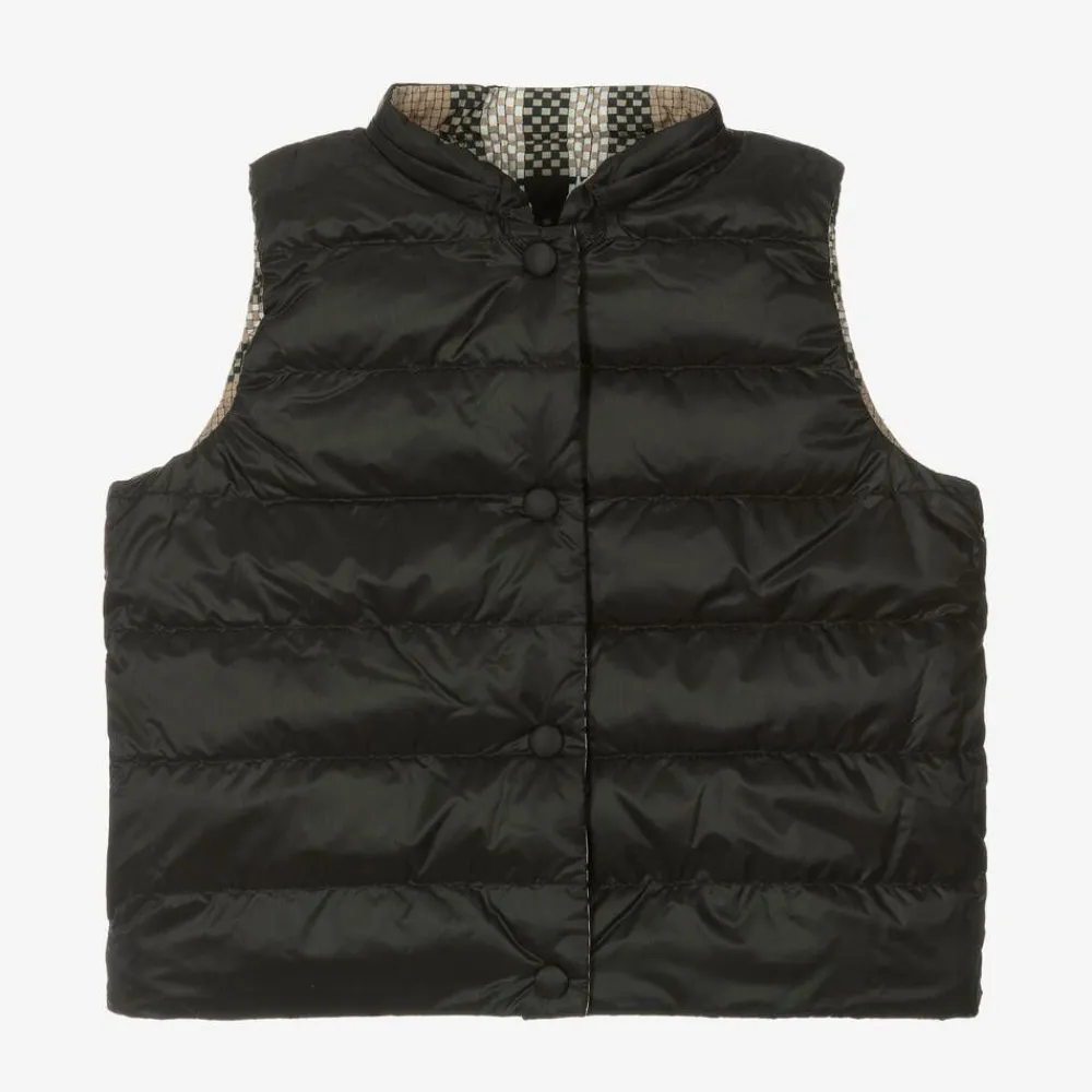 A reversible beige gilet for girls by luxury British designer Burberry, in a smooth fabric with a lightweight down filling. Unmistakably Burberry, their distinctive oversized check is redesigned in a modern basket weave print. The reverse is plain black with side seam pockets for an alternative look. This gilet fastens with poppers and has a removable zip-on hood.