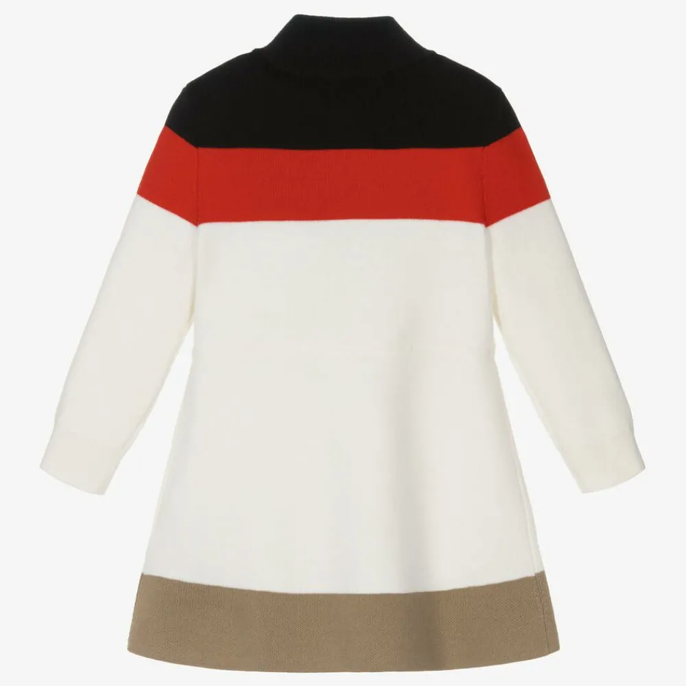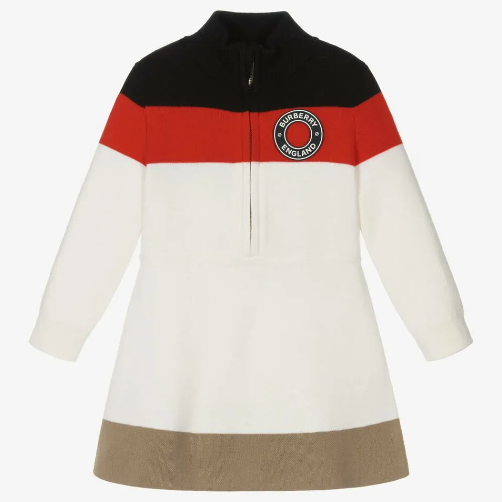 Luxury Merino wool dress for baby girls by Burberry, styled in the designer's classic Icon stripe. Featuring bold colours of ivory, beige, red and black, this warm and stylish sweater dress has a funnel neck with zip fastening and a silicone stamp logo at the chest. Responsibly sourced wool.