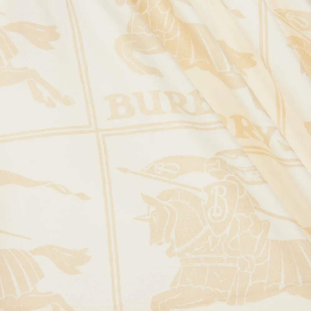 Ivory and beige dress for baby girls by luxury designer Burberry, made from soft cotton jersey. Iconic of the British brand, this short-sleeved shirt dress is designed with an Equestrian Knight Design and Burberry wordmark print in a beige colourway. It has a Peter Pan collar and a buttoned placket on the chest. This product contains organic cotton.