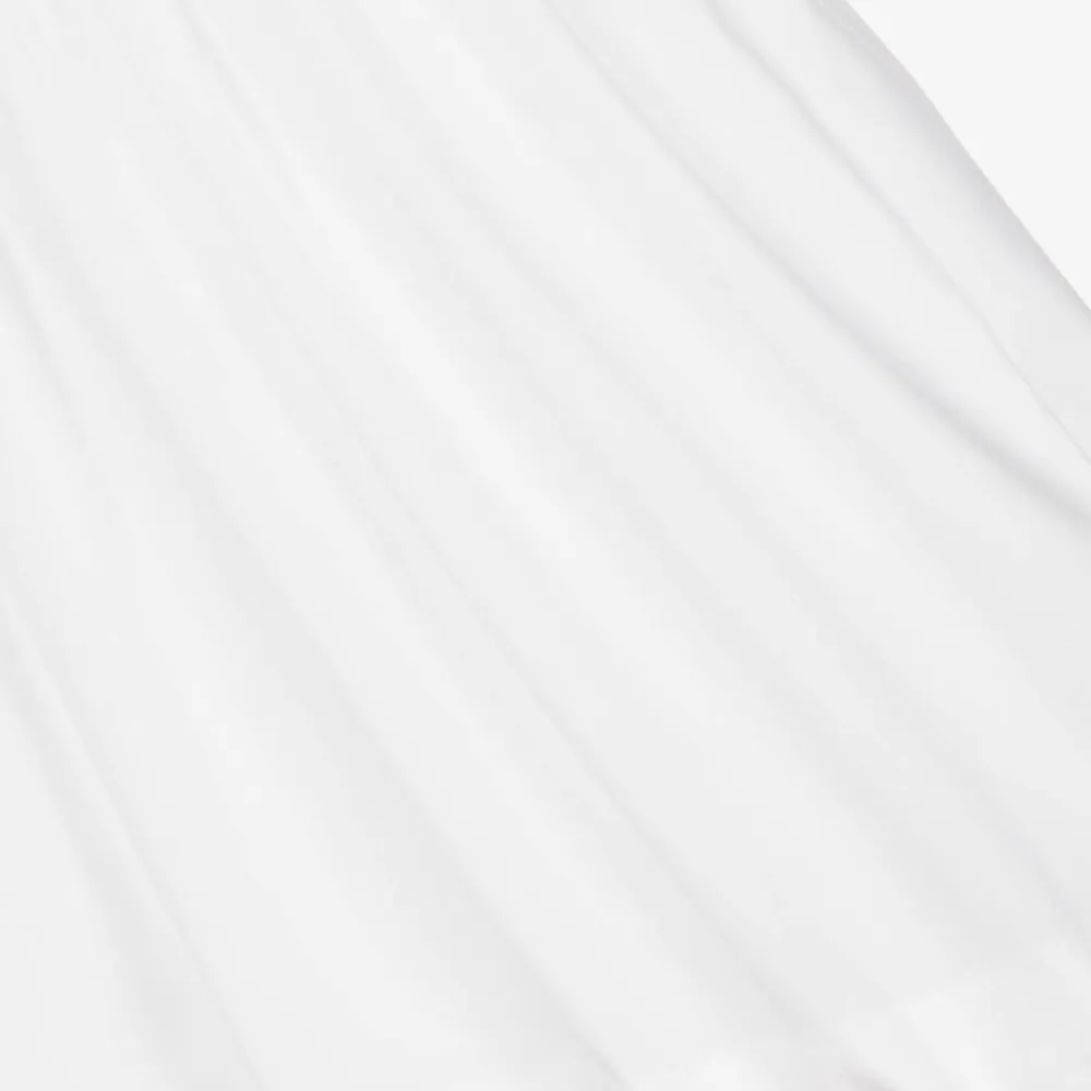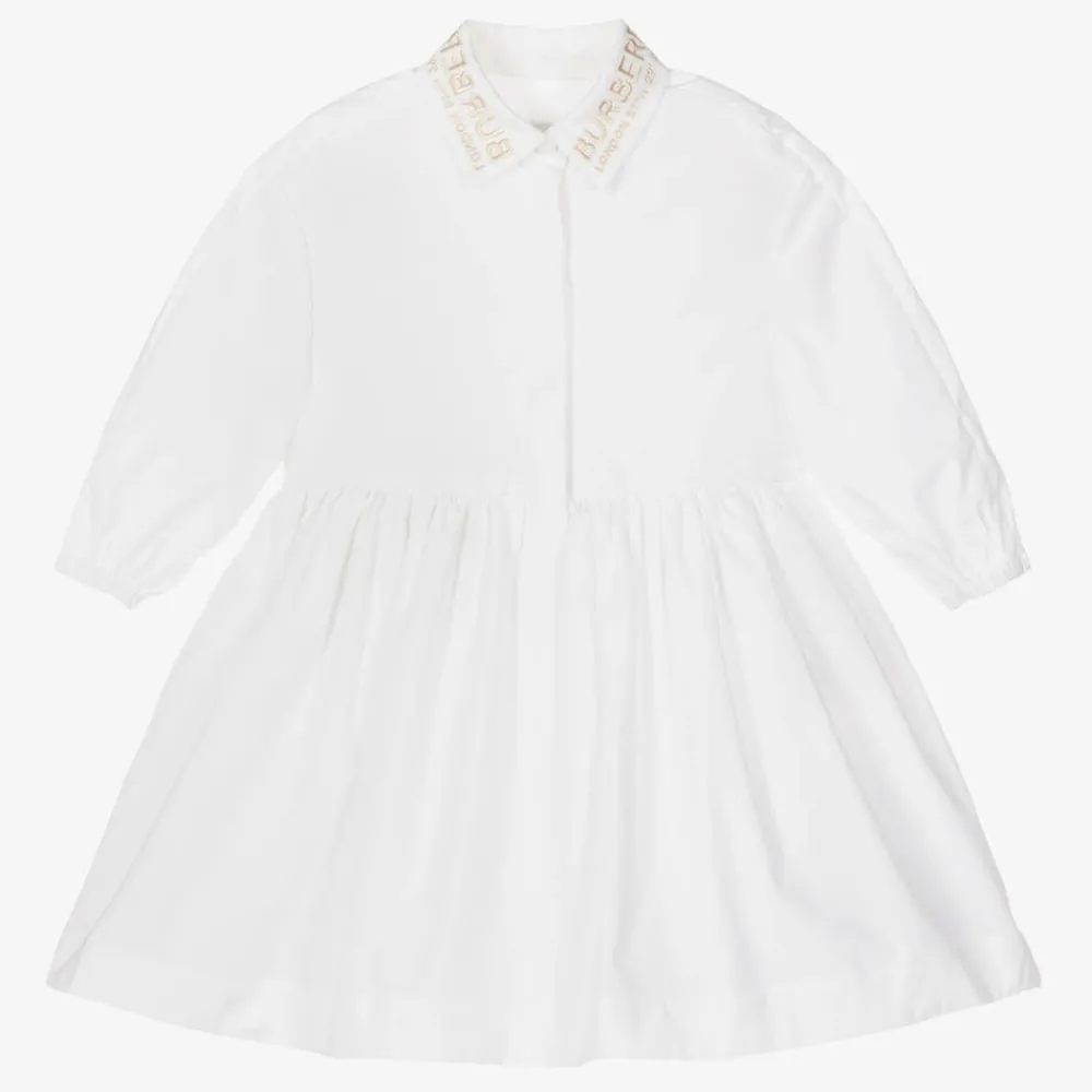 A white shirt dress for baby girls by luxury British brand Burberry, made from soft cotton poplin with a hint of stretch. Fastening with concealed buttons on the front, this lightweight design has a cape-style back that runs across the back of the shoulders and sleeves. Burberry HQ coordinates are embroidered on the collar in metallic beige for instant designer appeal. Gathered at the waist, it is lined with breathable cotton voile and finished with elasticated cuffs for ease of wear.