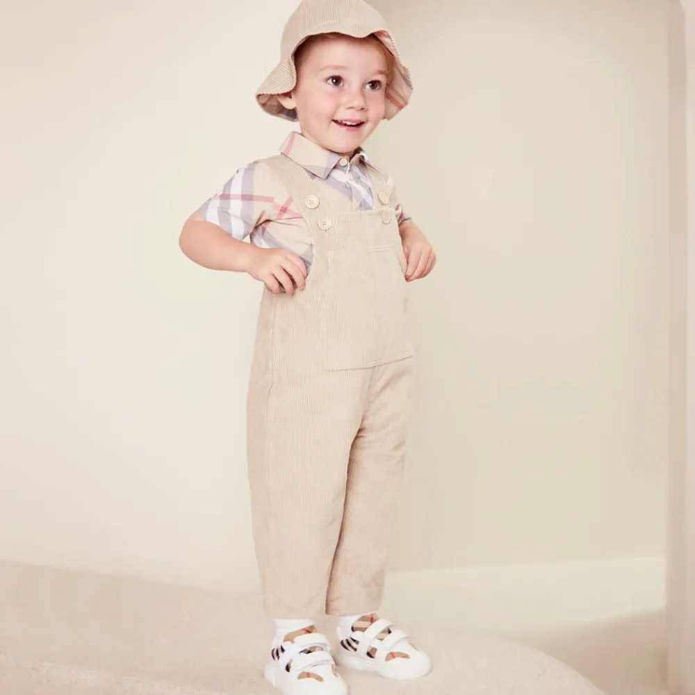 Charming beige cotton dungaree set for baby boys by luxury British label Burberry, presented in a branded gift box. Made in soft corduroy, the dungarees have a pocket on the front, button-up shoulder straps and useful poppers between the legs. The classically styled short-sleeved shirt is patterned in the brand's signature Burberry Check in a smart pale stone colourway. A reversible bucket hat completes the cute set. This product contains organic cotton.