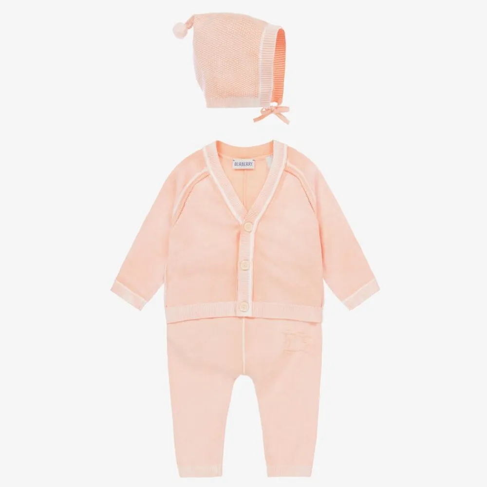 In a lovely shade of pale coral pink, this trouser set for baby girls by luxury British brand Burberry is presented in a delightful gift box. Comfortable to wear, the set is made from a soft cotton knit with a washed look and ribbed trims. The long-sleeved V-neck cardigan fastens with pearlescent branded buttons and the adorable bonnet has a sweet pom-pom detail and ties neatly under the chin. The joggers have a tonal jacquard Equestrian Knight Design for a signature look and an elasticated waist for a comfortable fit.