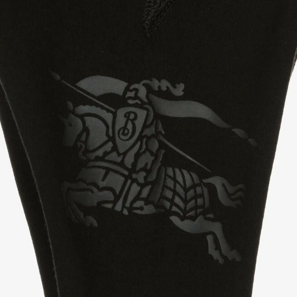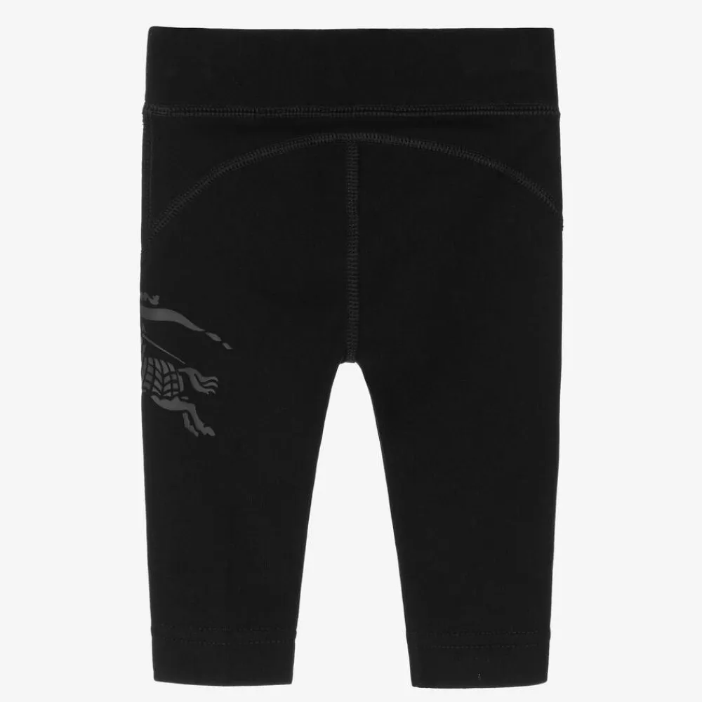 A pair of black cotton full-length leggings for baby girls from luxury brand Burberry. So soft and comfortable on delicate skin, they bear the label's heritage Equestrian Knight Design in tonal black print to one side, adding that signature touch the designer is renowned for. They have an elasticated waist for simple dressing and changing. These leggings contain organic cotton.