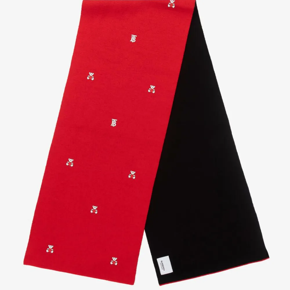 Beautiful red and black Merino wool scarf for girls and boys by Burberry. Luxuriously soft and warm, the red side has a print of the brand's signature mini teddy bear motif and TB logo initials. The reverse is plain black for a stylish colour contrast.