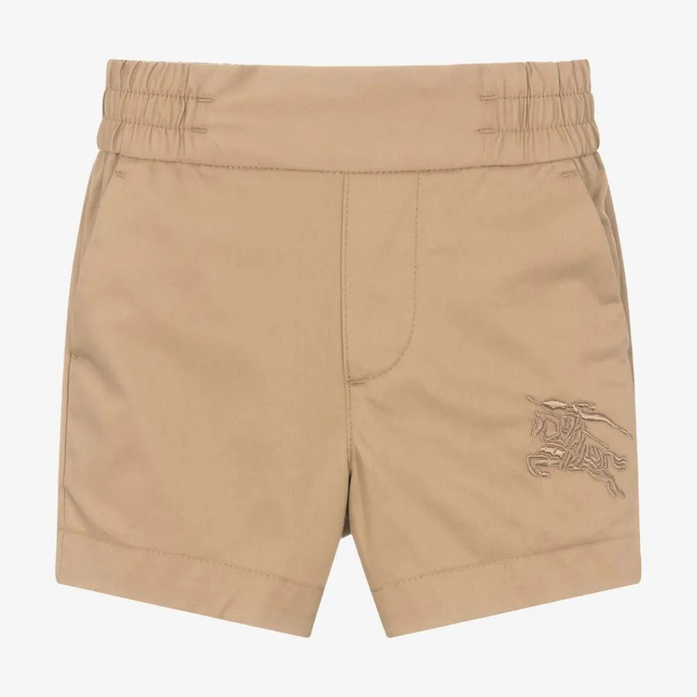 Archive beige chino shorts for baby boys by luxury British designer Burberry, made from soft cotton twill. For a touch of heritage, they are embroidered with the renowned Equestrian Knight Design on one leg. They have pockets on the front and back and an elasticated waistband for added comfort.