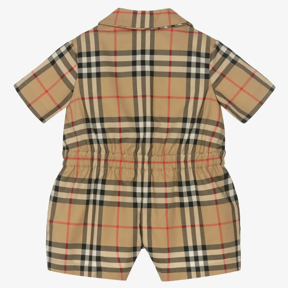 Smooth cotton poplin playsuit for baby girls by Burberry. Printed in the brand's signature archive beige check, this smart onesie is cool and comfortable to wear. It fastens with buttons down the front and has a revere collar, an elasticated waistband and poppers between the legs for easy dressing and changing.