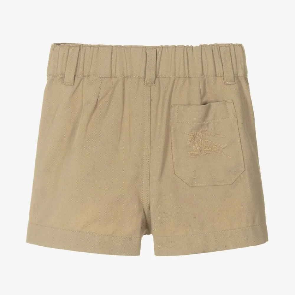 Beige twill shorts for baby boys by luxury British brand Burberry, made in a soft cotton blend. Fastening with a simple hook, they have an elasticated waistband for comfort. The designer's Equestrian Knight Design, embroidered in tonal thread on the back pocket, adds a discreet branded touch.