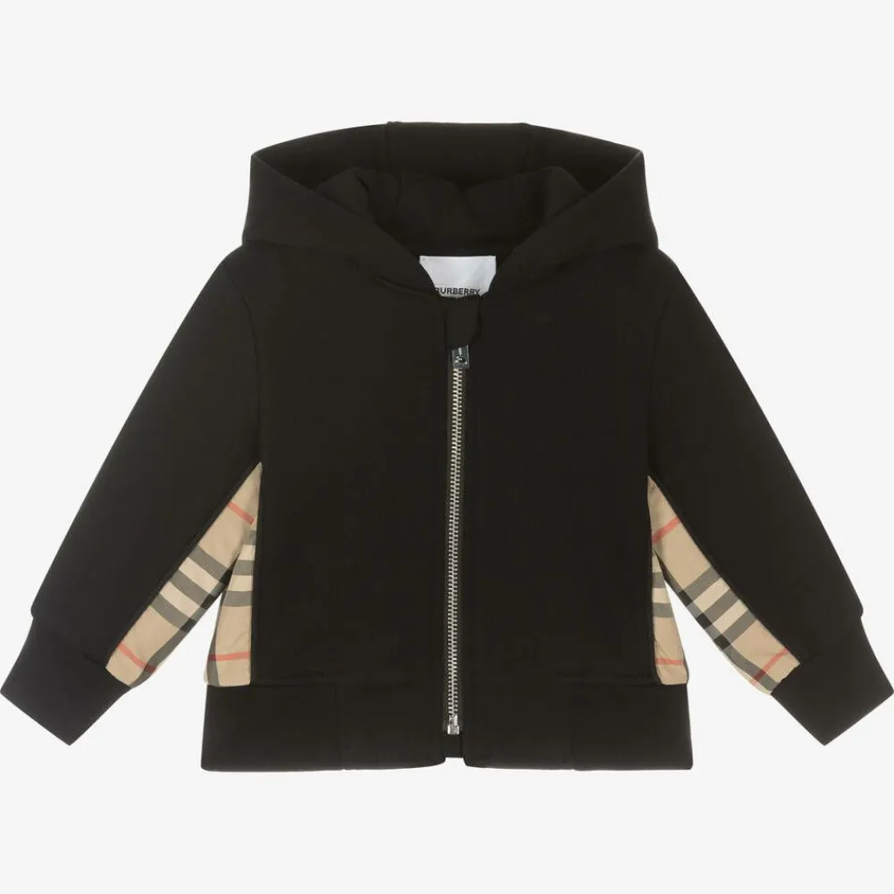 Unmistakably Burberry, this black zip-up hooded top for baby boys is made in mid-weight cotton jersey. The luxury designer's beige Vintage check pattern can be found on silky side trims. There are concealed pockets and a premium weight silver logo zip fastens the front.