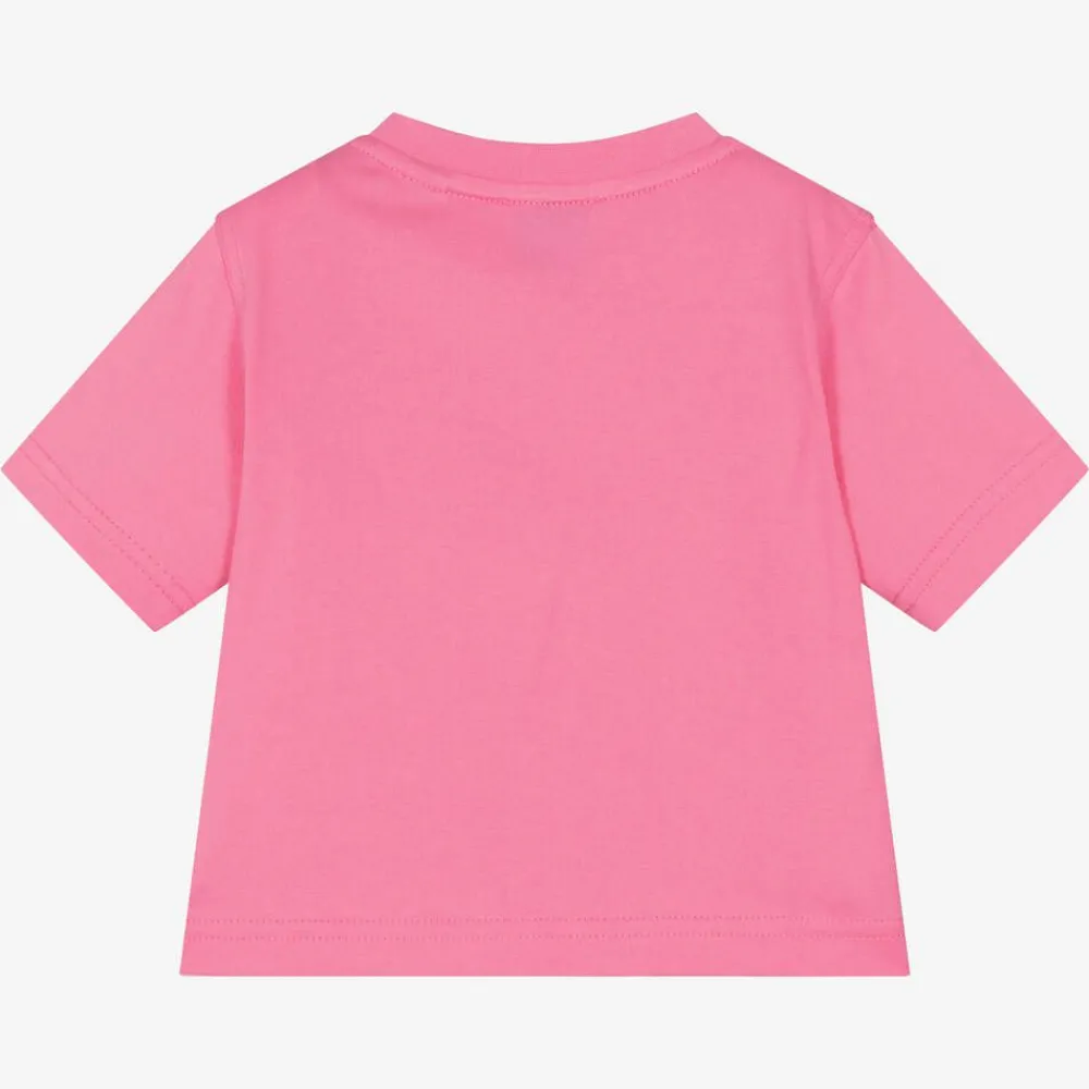 Bright pink cotton T-shirt for baby girls by British luxury brand Burberry, designed for casual days. The front is printed with an archival beige Horseferry logo print for instant designer appeal. It fastens with pink button fastenings on one shoulder for cute style. This product contains organic cotton.
