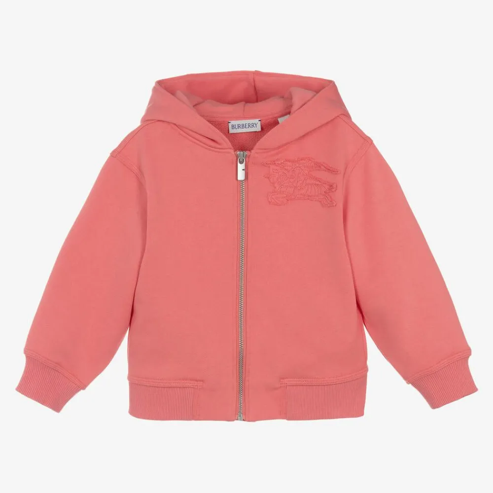 A long-sleeved hoodie for girls by luxury British brand Burberry, in a bold coral pink shade. Fastening with a silver-tone zip on the front, it is stitched with a tonal frayed-edged Equestrian Knight Design patch on the chest for a branded finish. Made from soft mid-weight cotton jersey, it has ribbed trims to enhance the casual style. This product contains organic cotton.