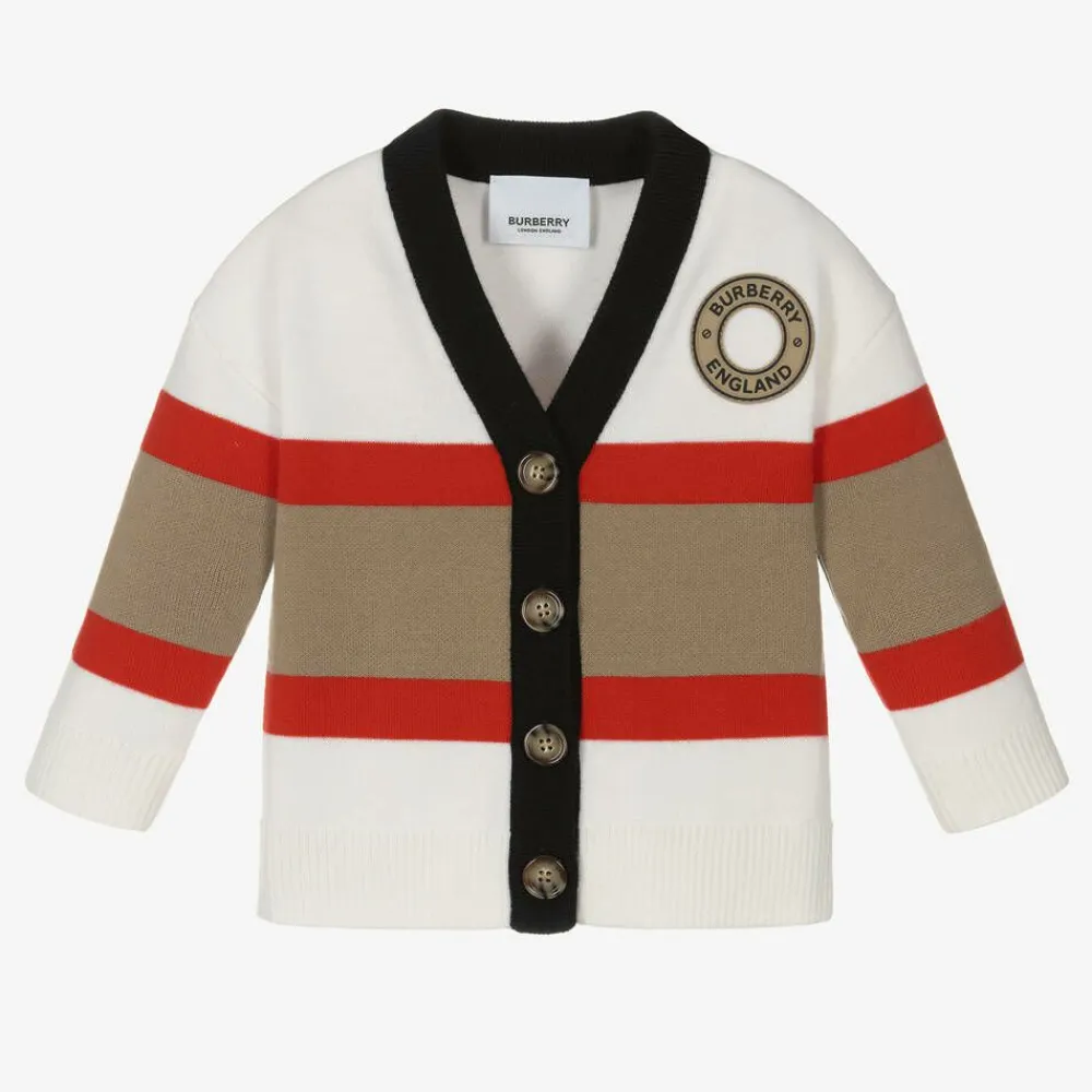 Luxury Merino wool knitted cardigan for baby girls by Burberry, styled in the designer's classic Icon stripe. Featuring bold colours of ivory, beige, red and black, this warm and stylish knit is soft and stretchy, with a silicone stamp logo at the chest and button fastenings . Responsibly sourced wool.
