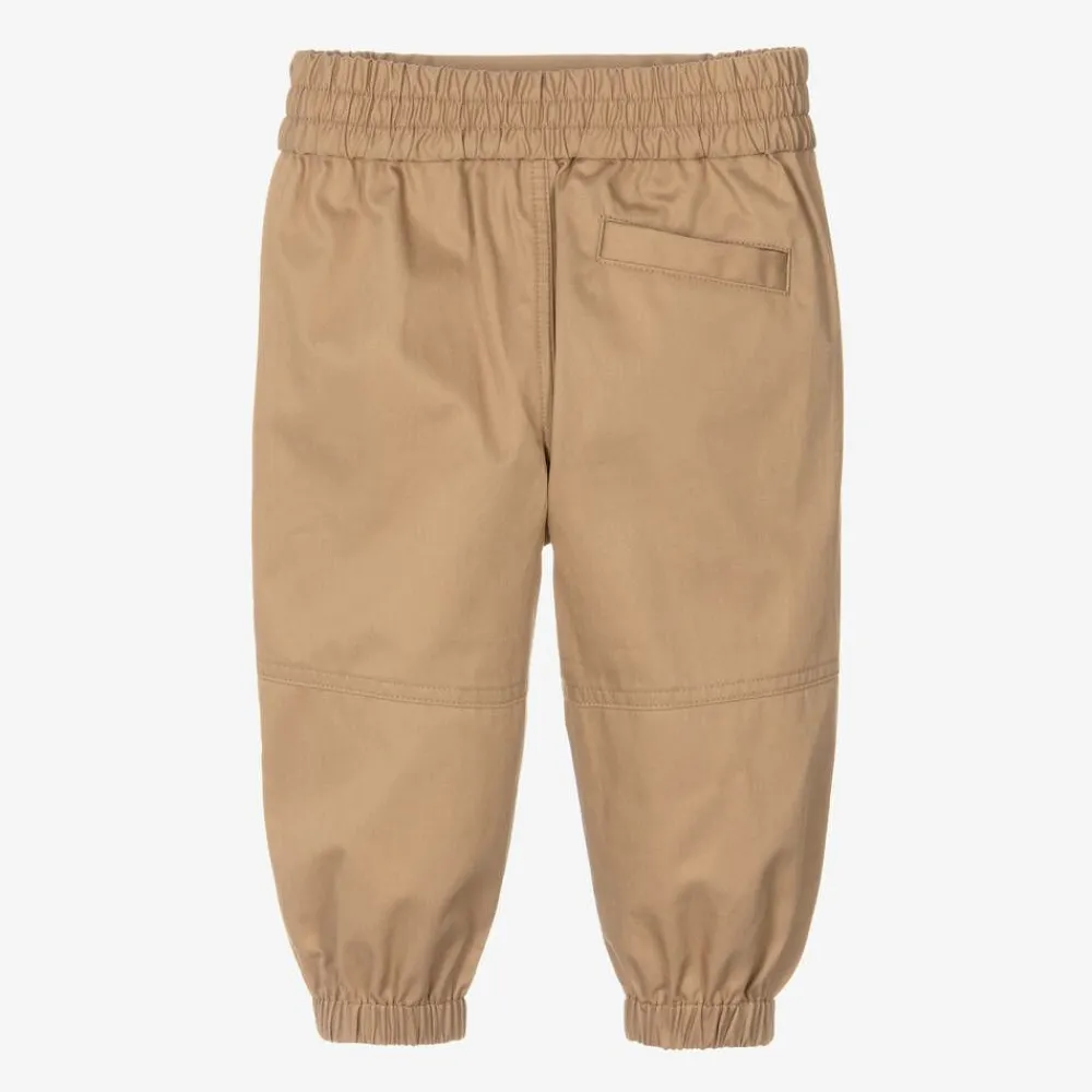Casual trousers for baby boys from Burberry, made in the luxury British brand's Archive beige cotton twill. A tone-on-tone Equestrian Knight Design is embroidered on one leg for an iconic look. Soft and smooth, this comfortable style is designed in a relaxed fit with knee tucks, discreet side pockets and a back pocket. Simply pull-on, they have an elasticated waistband and ankle cuffs.