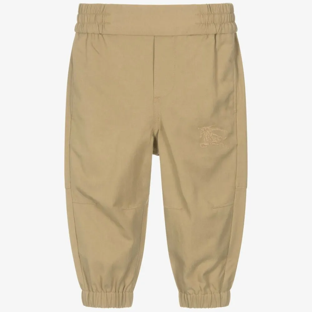Beige cotton-blend twill trousers for baby boys by luxury brand Burberry. In a comfortable relaxed fit, they are elasticated around the waist and cuffs, with side seam pockets and an additional pocket on the back. A tonal embroidered Equestrian Knight Design adds a signature finish.