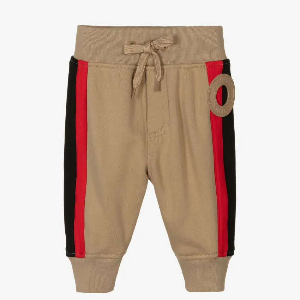 Beige joggers for baby boys by luxury British brand Burberry, with a large rubberised logo on one leg and sporty red and black stripes along the sides. They are made in soft, stretchy cotton jersey for all-day comfort with ribbed cuffs for cosiness and a useful patch pocket around the back. Easy to wear, they have a drawstring waistband for a good fit.